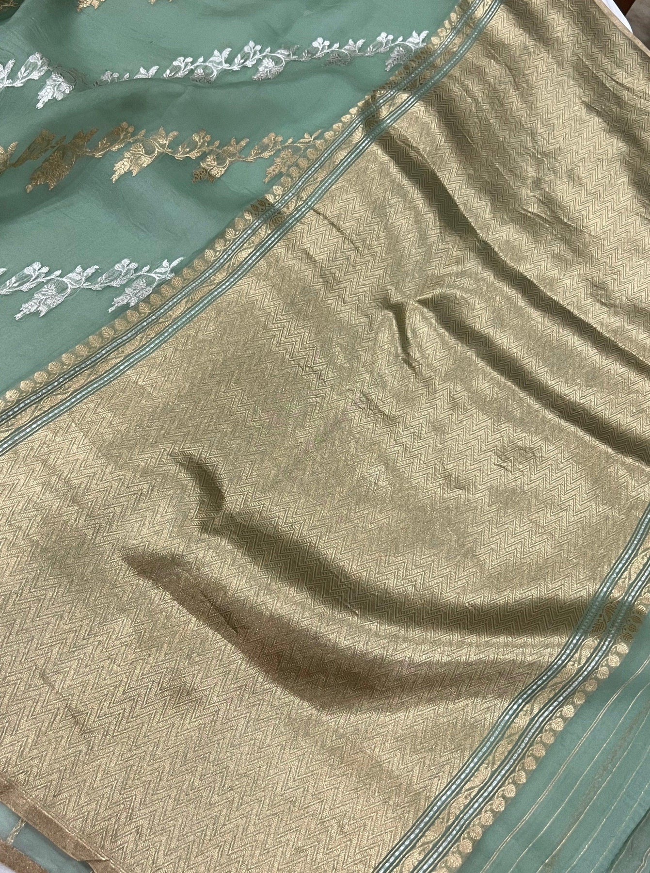 Greyish Green Banarasi Handloom Kora Silk Saree