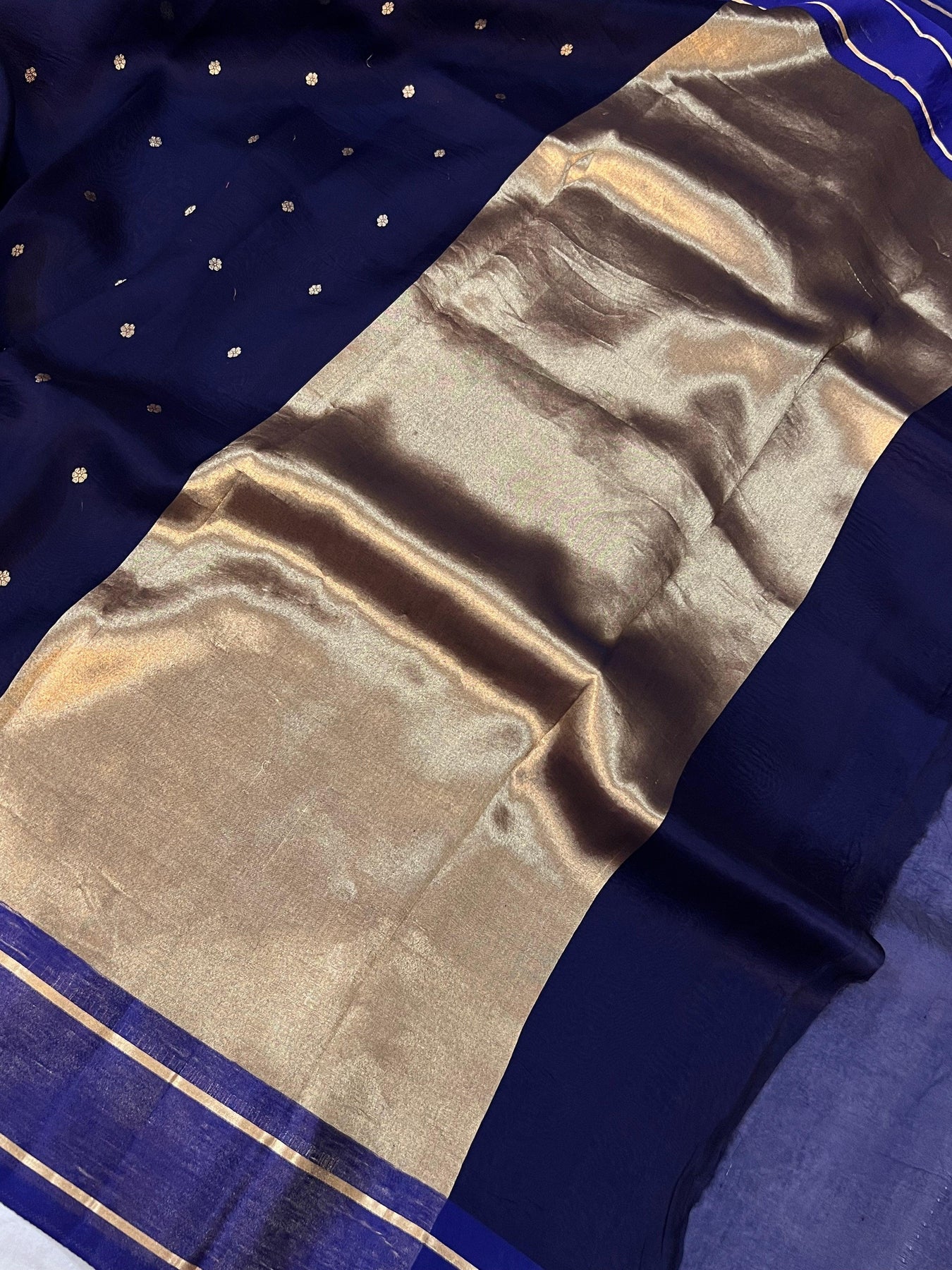 An amazing Handwoven Pure Kora Silk in a Navy Blue color to take your breath away. This vintage piece has an allover Kadwa(Kadhua) motifs in golden zari. The border is beautifully woven in satin silk with golden zari lines running parallel till the end. It comes with a plain blouse piece.