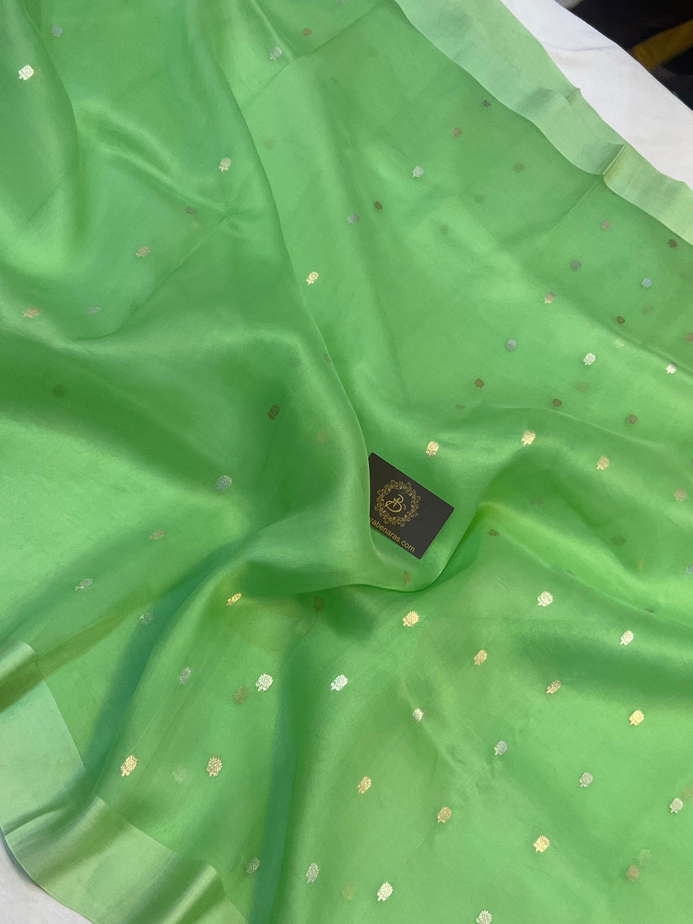 Pista Green Pure Kora Silk Handloom Banarasi Saree with Kadhwa Buti & Mashru Border