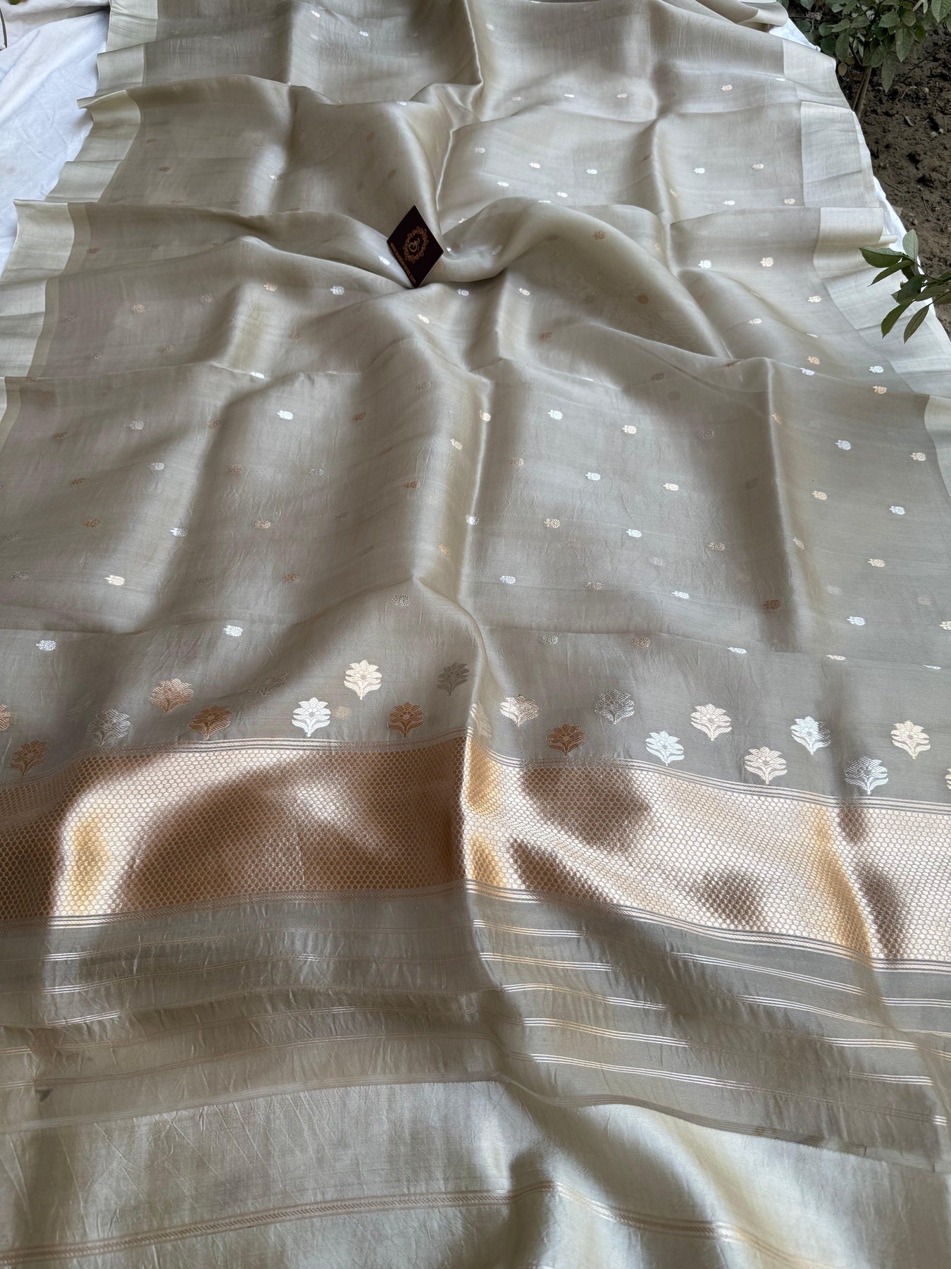 Silken Ash Grey Pure Banarasi Handloom Kora Silk Saree with Kadhwa Buti & Mashru Border