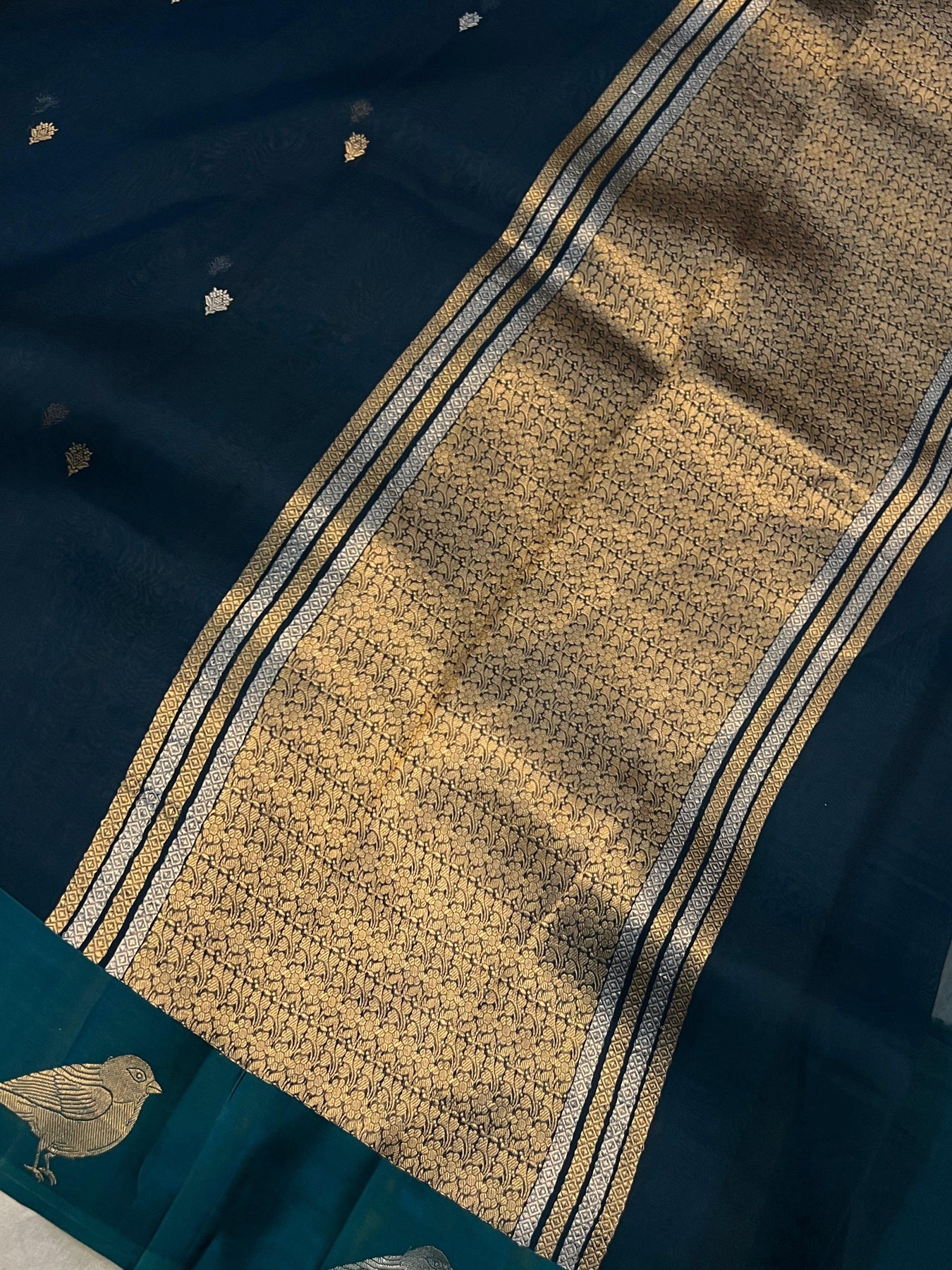 Teal Blue Banarasi Handloom Kora Silk Saree | Kadhwa Weave | Aura Benaras