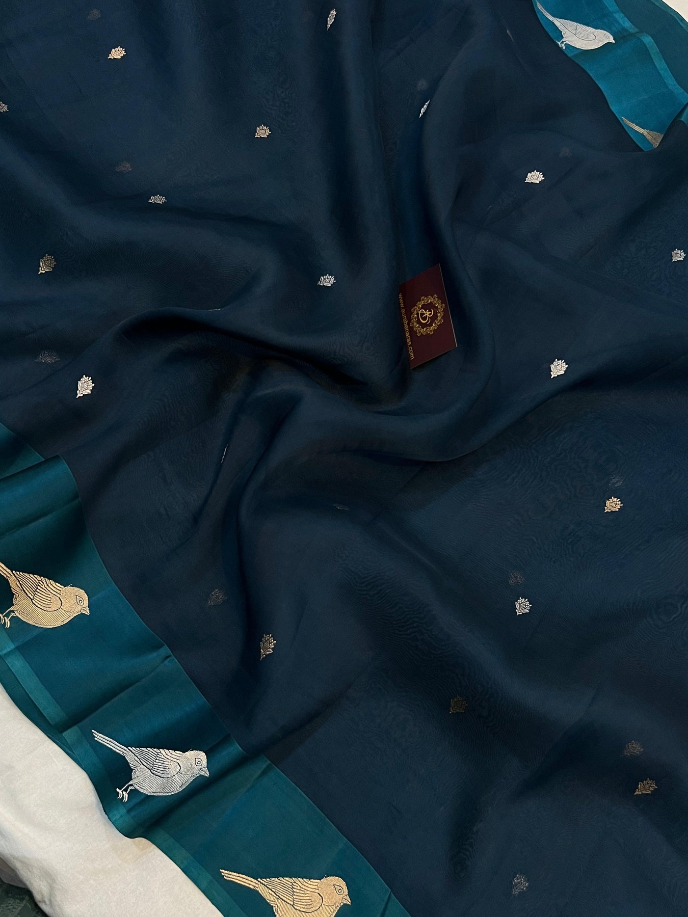 Teal Blue Pure Banarasi Handloom Kora Silk Saree