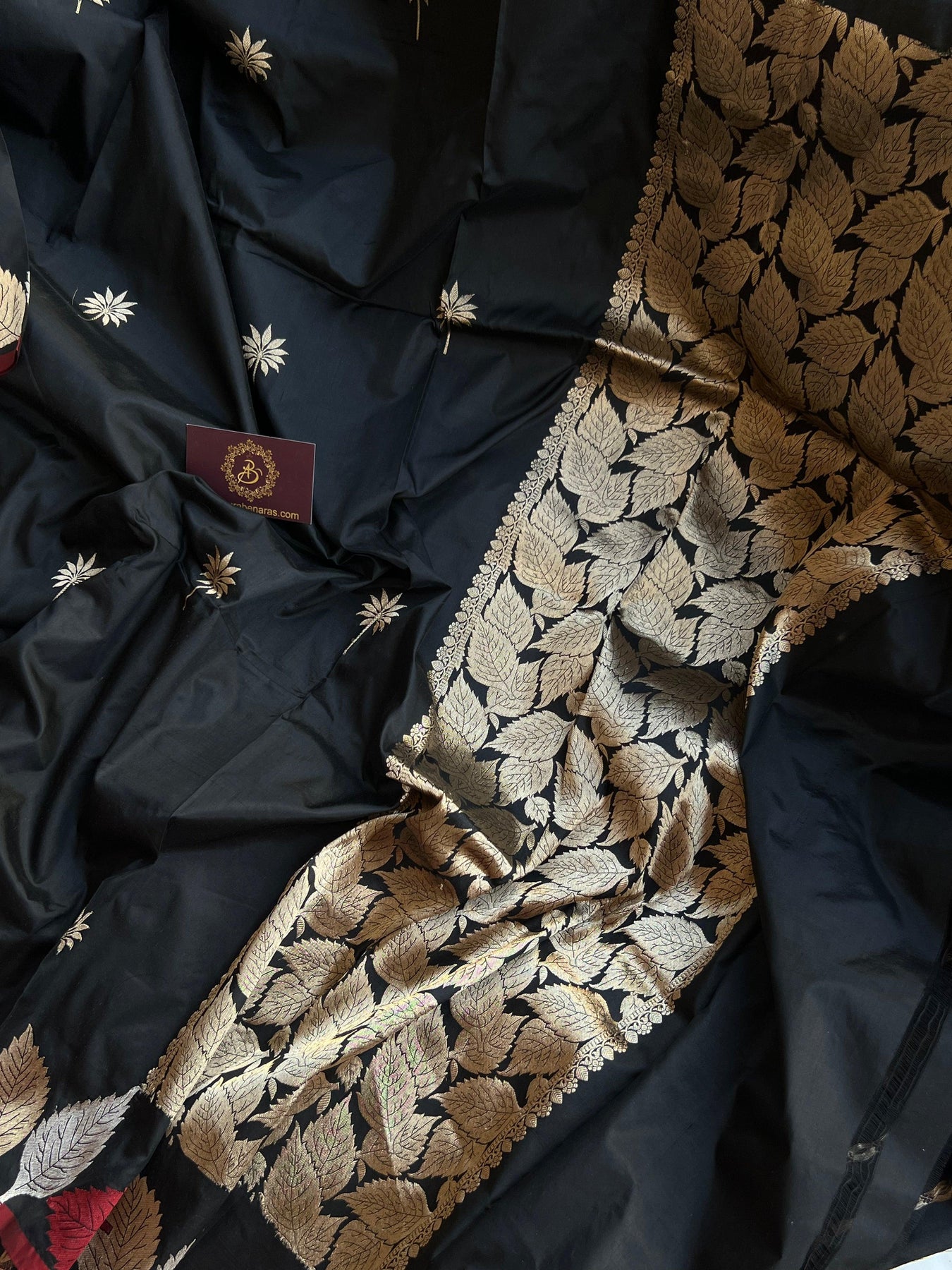 A stunning Black Banarasi handloom classic with kadhua(kadwa) buta work. The authentic Kadhwa motifs with meenakari designer border handwoven in the finest Katan silks, comes with a buti work blouse. It takes around 10 days to weave this rich and luxurious piece of our tradition.