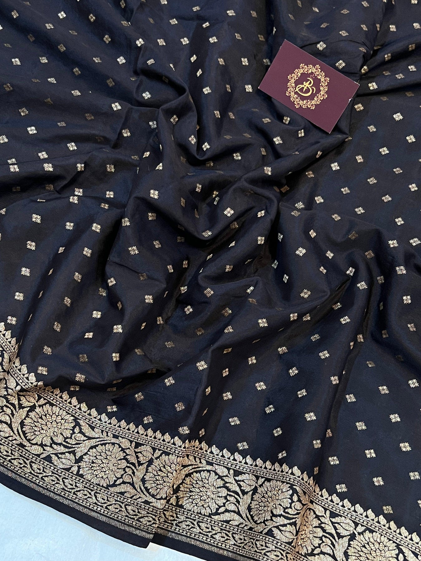 A stunning Black Banarasi handloom classic. The authentic buti work in antique zari handwoven in the finest crepe silks, comes with a same color heavy jaal work blouse. It takes around 10 days to weave this rich and luxurious piece of our tradition.