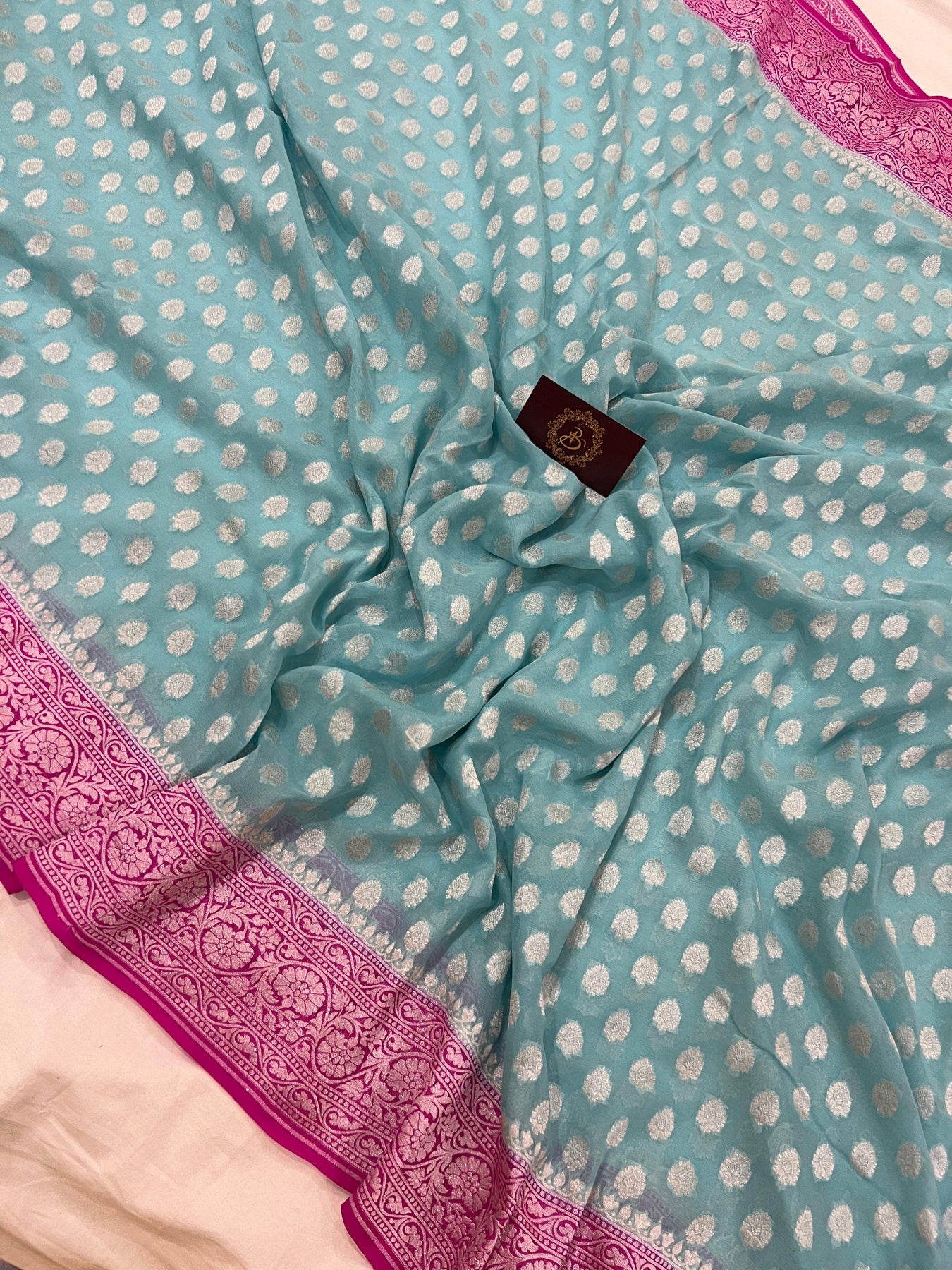 • Color - An enchanting Blue with scintillating pink palla and border.
