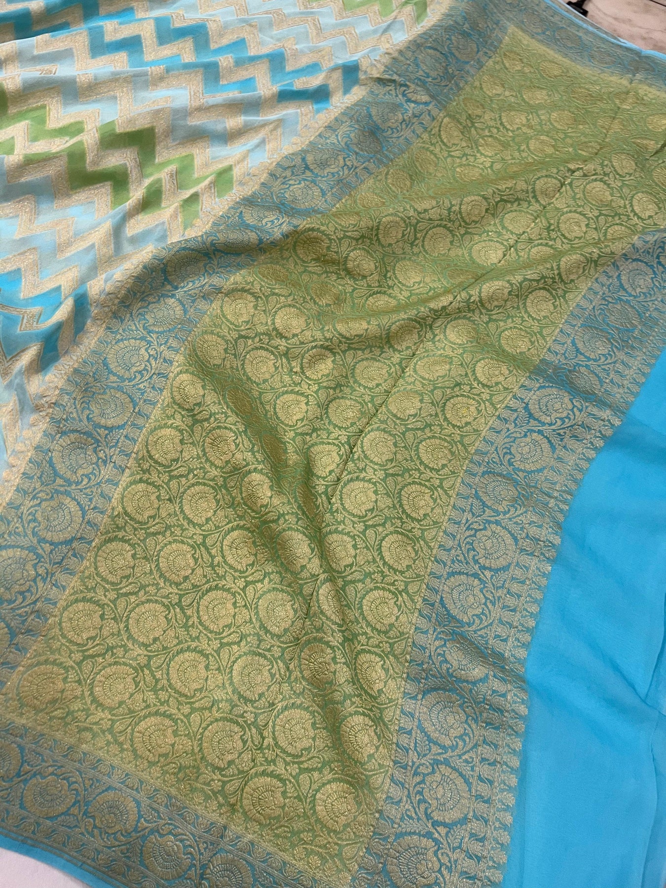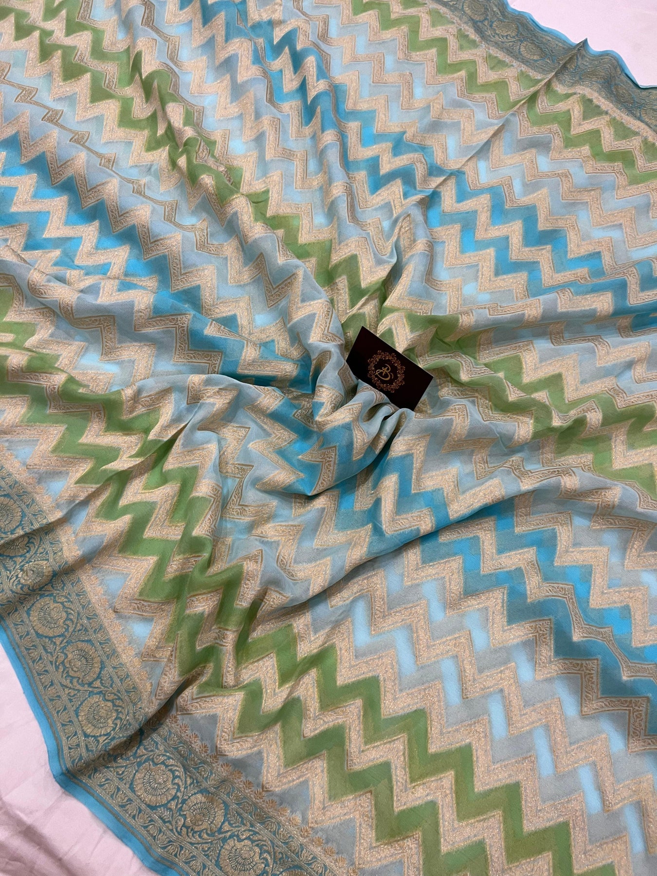 A stunning Blue Banarasi handloom classic. The authentic zig zag work in golden zari with Rangkaat work handwoven in the finest chiffon georgettes, it comes with a contrast color plain blouse. It takes around 10 days to weave this rich and luxurious piece of our tradition.