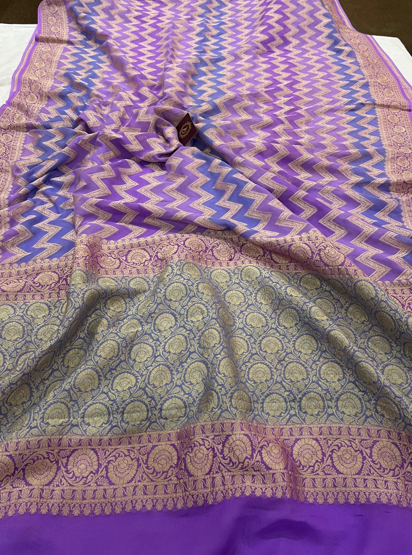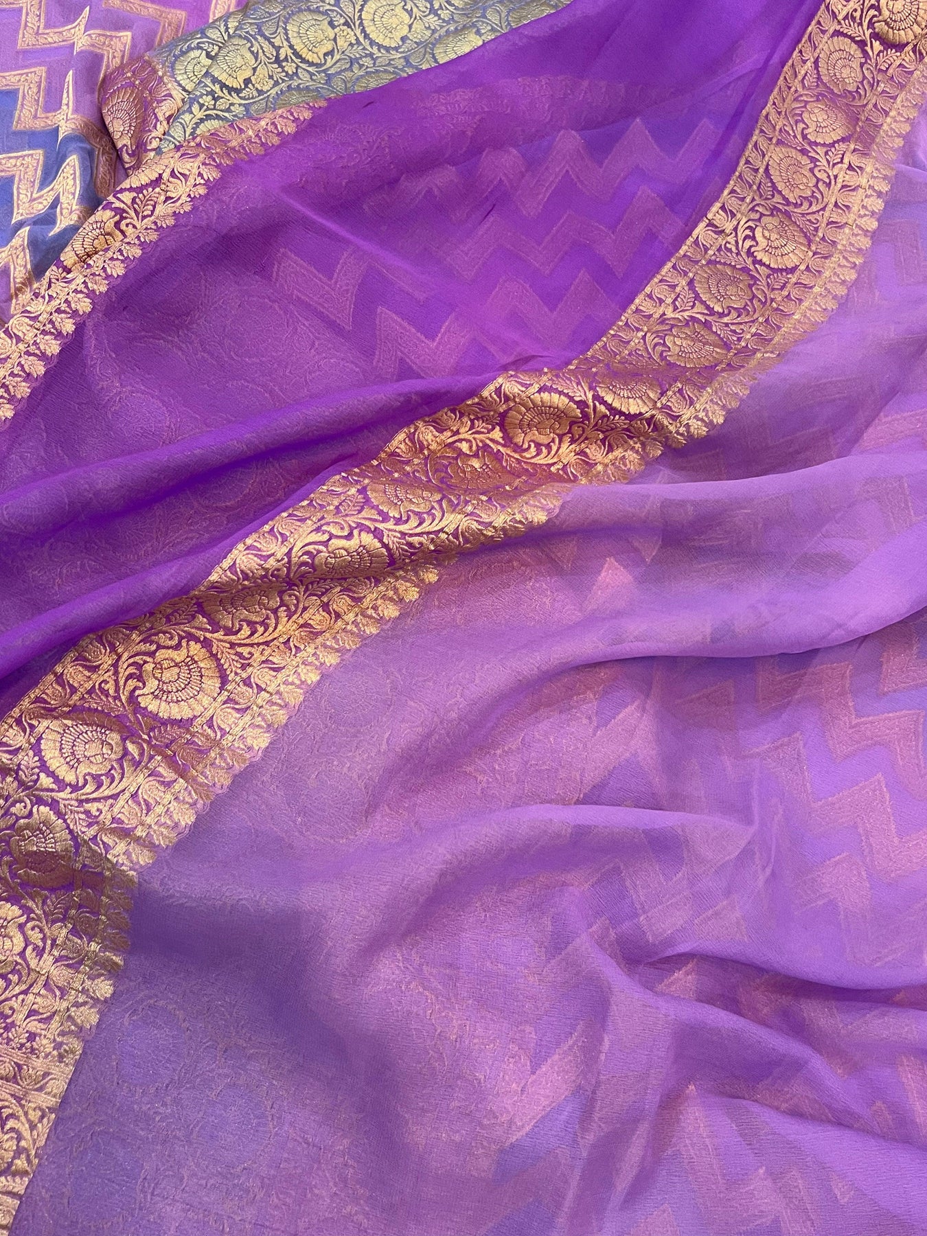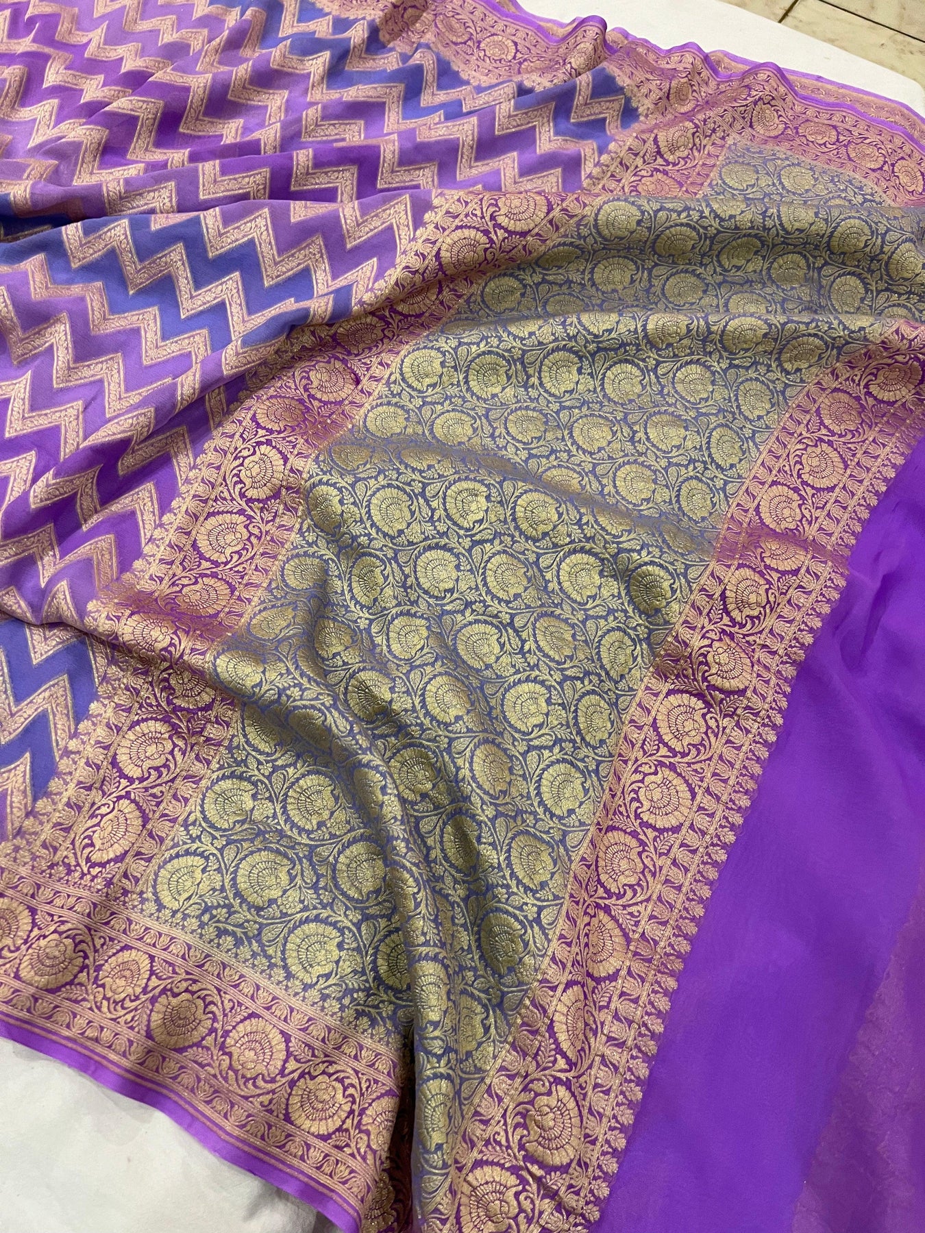 A stunning Lavender Banarasi handloom classic. The authentic zig zag work in golden zari with Rangkaat work handwoven in the finest chiffon georgettes, it comes with a contrast color plain blouse. It takes around 10 days to weave this rich and luxurious piece of our tradition.