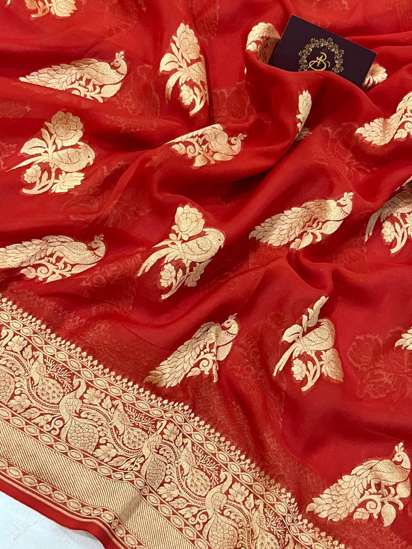 A stunning Orange Banarasi handloom classic. The authentic bird motifs in golden zari handwoven in the finest chiffon georgettes. It comes with a plain blouse. It takes around 10 days to weave this rich and luxurious piece of our tradition.
