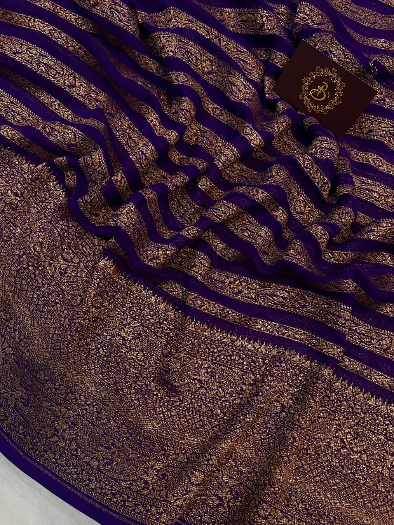 A stunning Purple Banarasi handloom classic with broad border. The authentic saree with antique zari stripes design handwoven in the finest chiffon georgettes, comes with a plain blouse. It takes around 10 days to weave this rich and luxurious piece of our tradition.