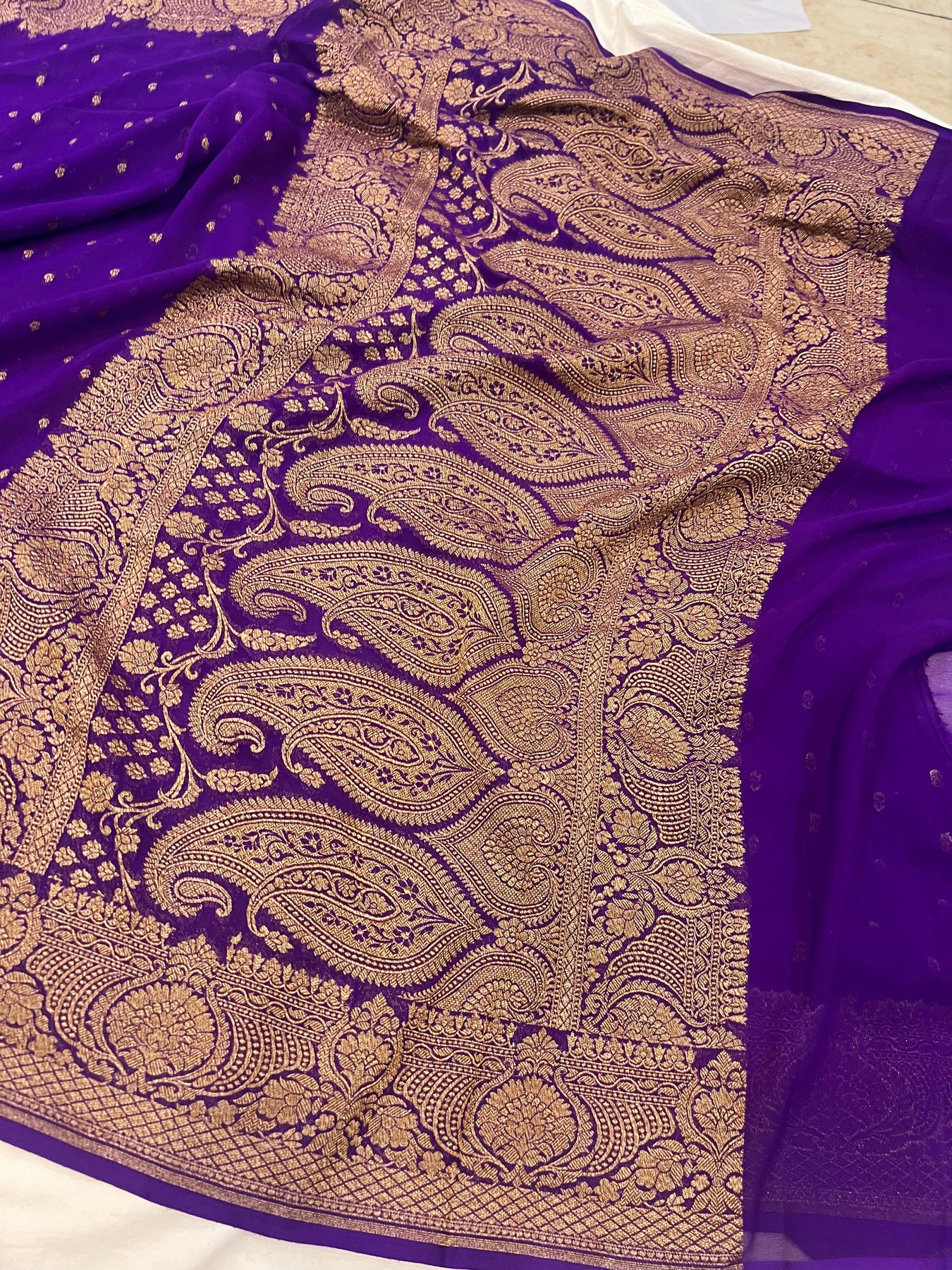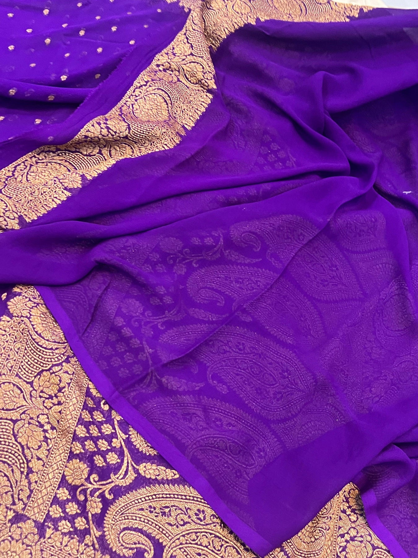 A stunning Purple Banarasi handloom classic. The saree has small motifs all over the saree with designer border. Handwoven in the finest chiffon georgettes with antique zari work. The saree comes with a same color plain blouse piece. It takes around 10 days to weave this rich and luxurious piece of our tradition.