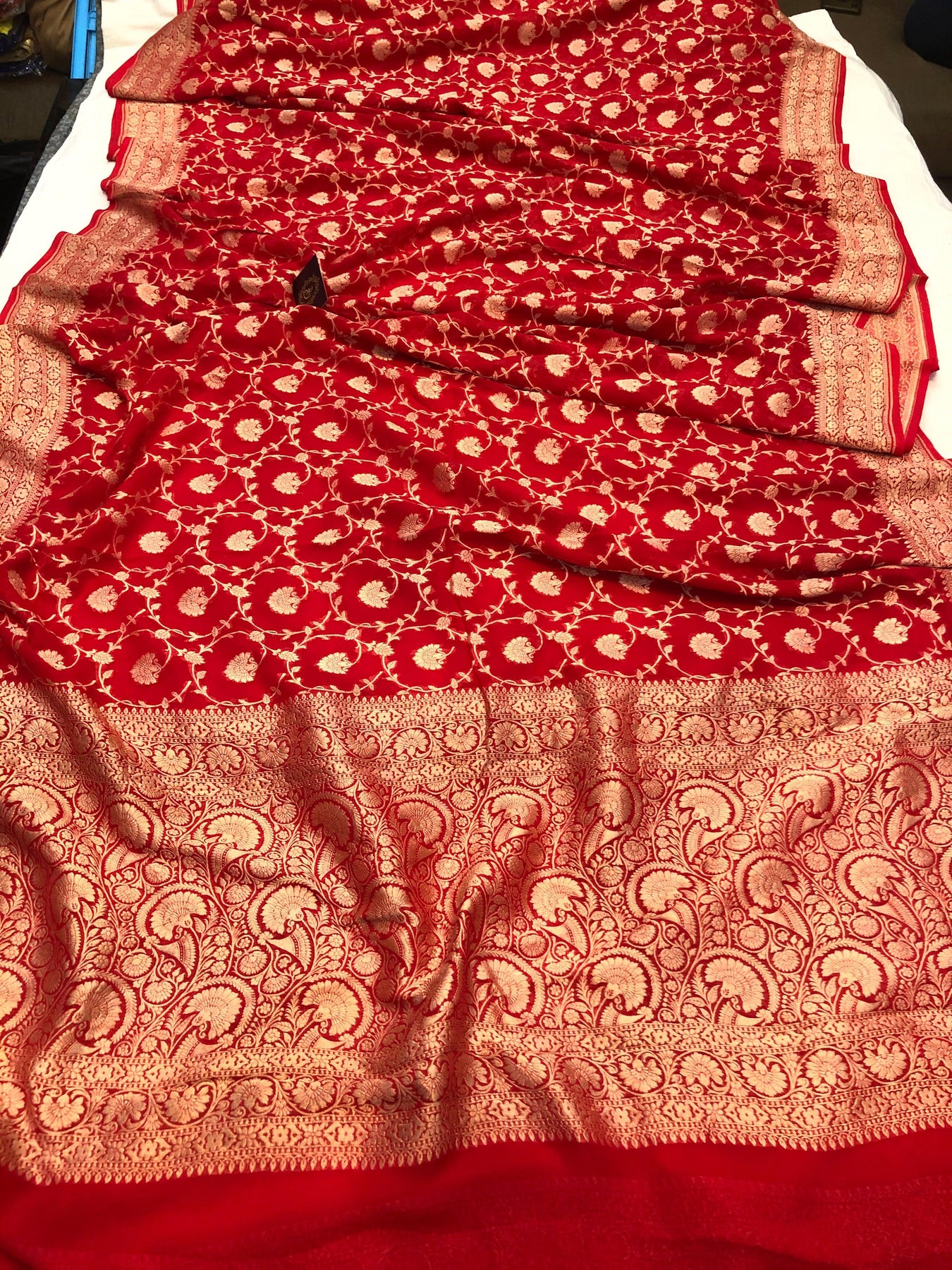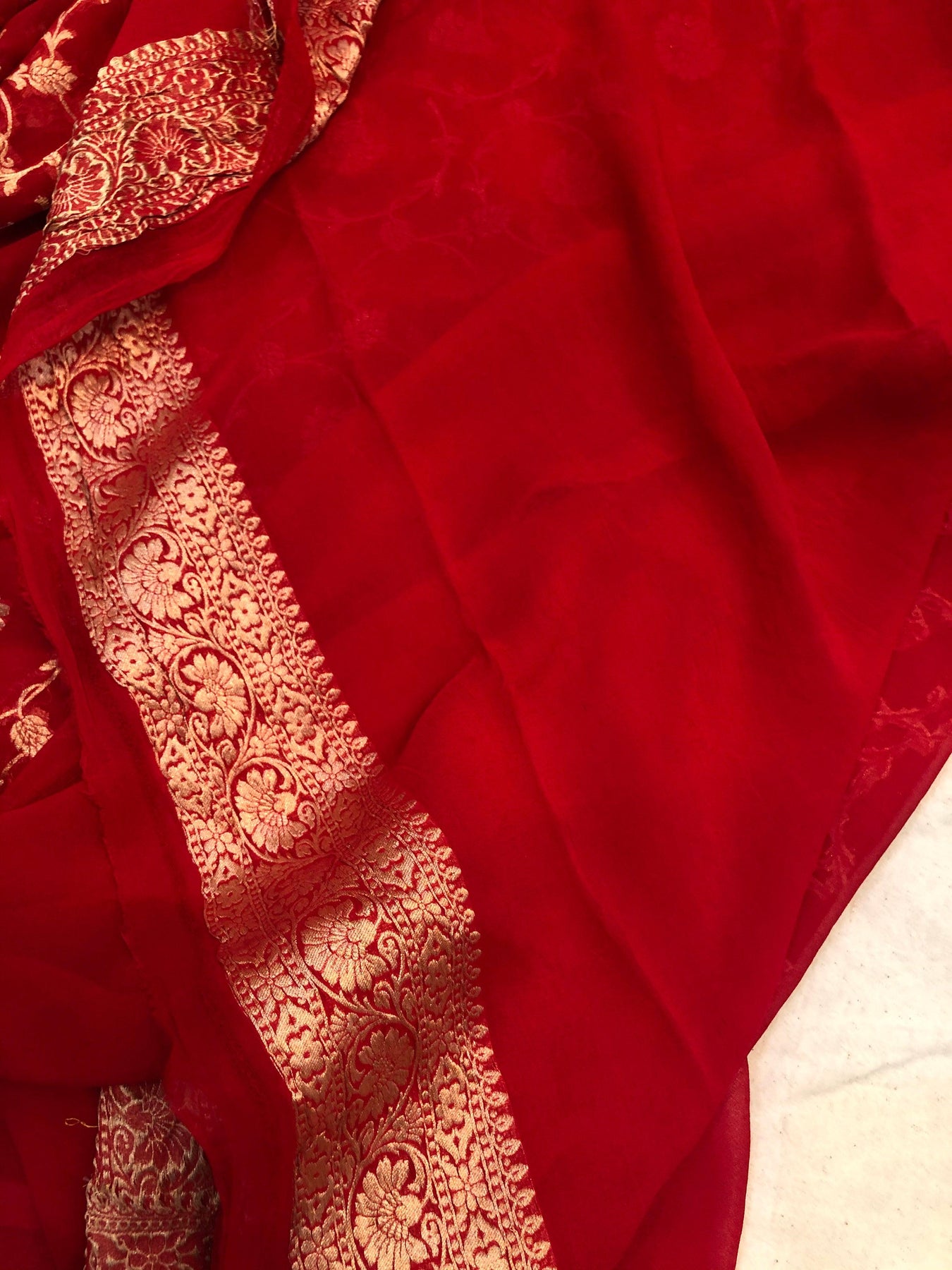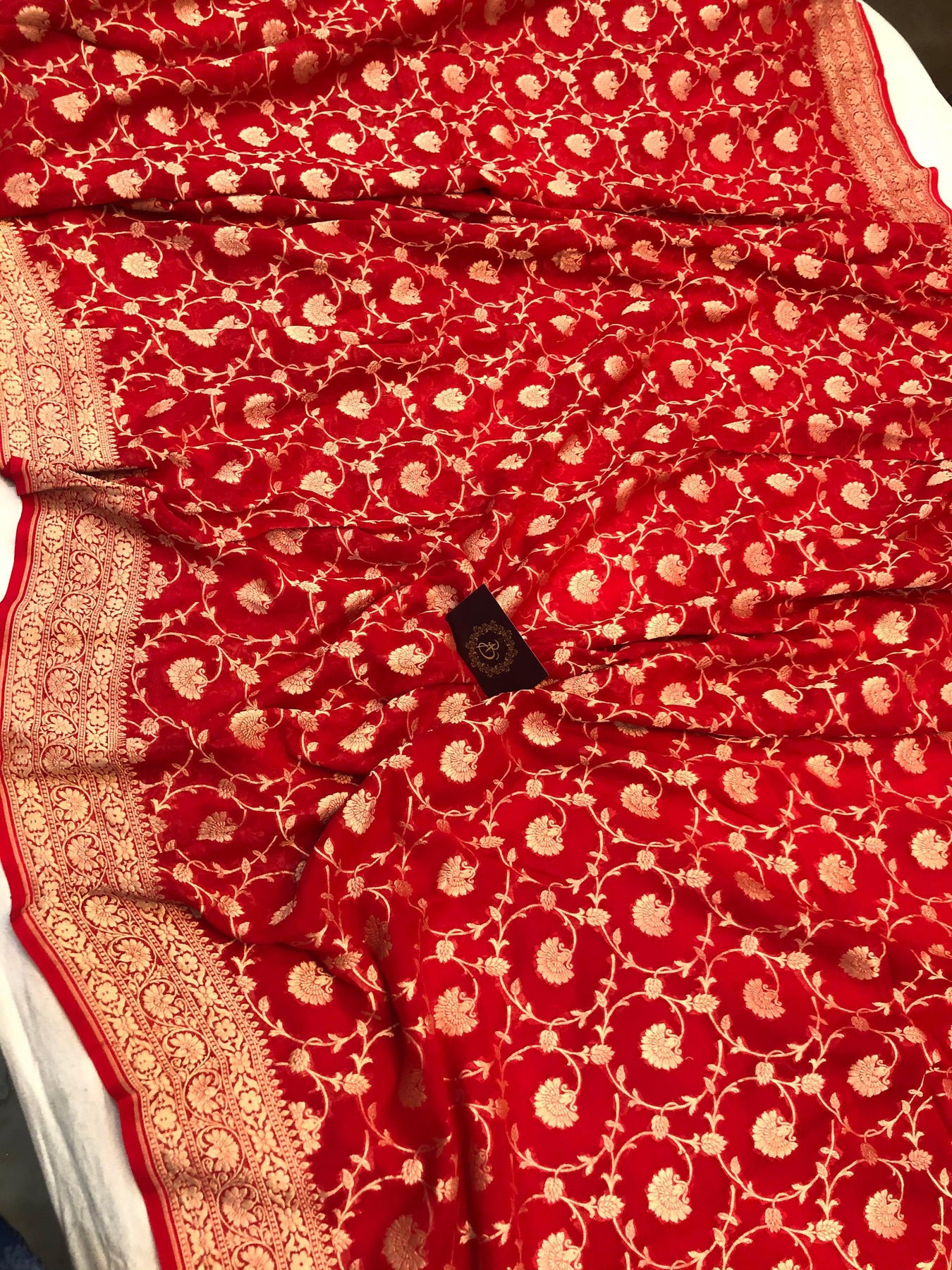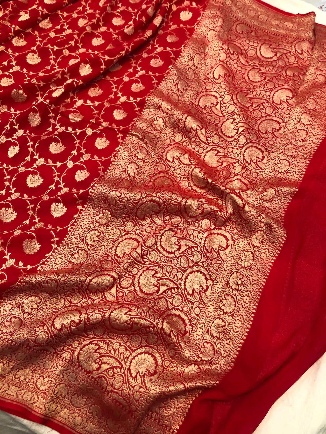 A stunning red Banarasi handloom classic.The authentic jaal work woven in gold zari in the finest chiffon georgettes, comes with a plain blouse. It takes around 10 days to weave this rich and luxurious piece of our tradition.