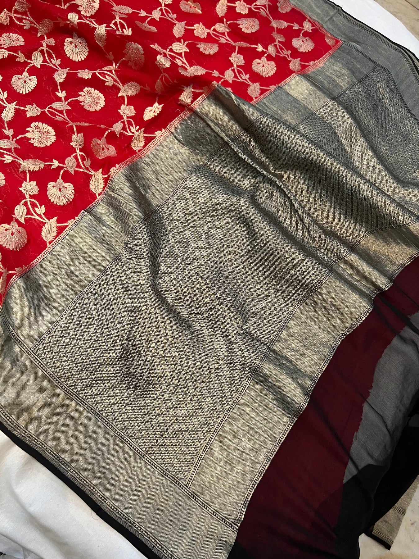 - Color - An enchanting Red with scintillating black palla and border.