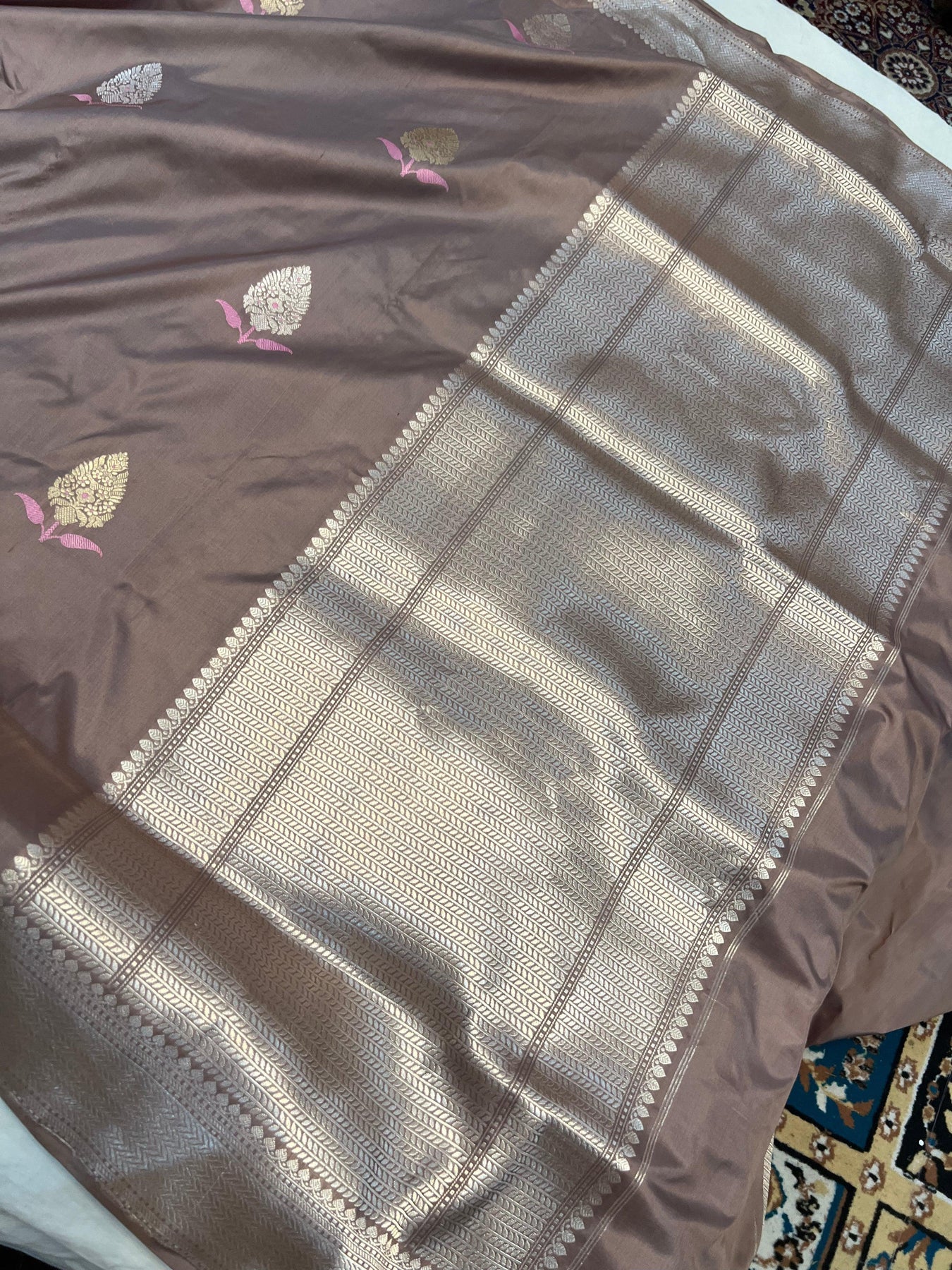 A stunning Taupe color Banarasi handloom classic with kadhua(kadwa) buta work. The authentic Kadhwa floral motifs with meenakari work handwoven in the finest Katan silks,comes with a plain blouse. It takes around 10 days to weave this rich and luxurious piece of our tradition.