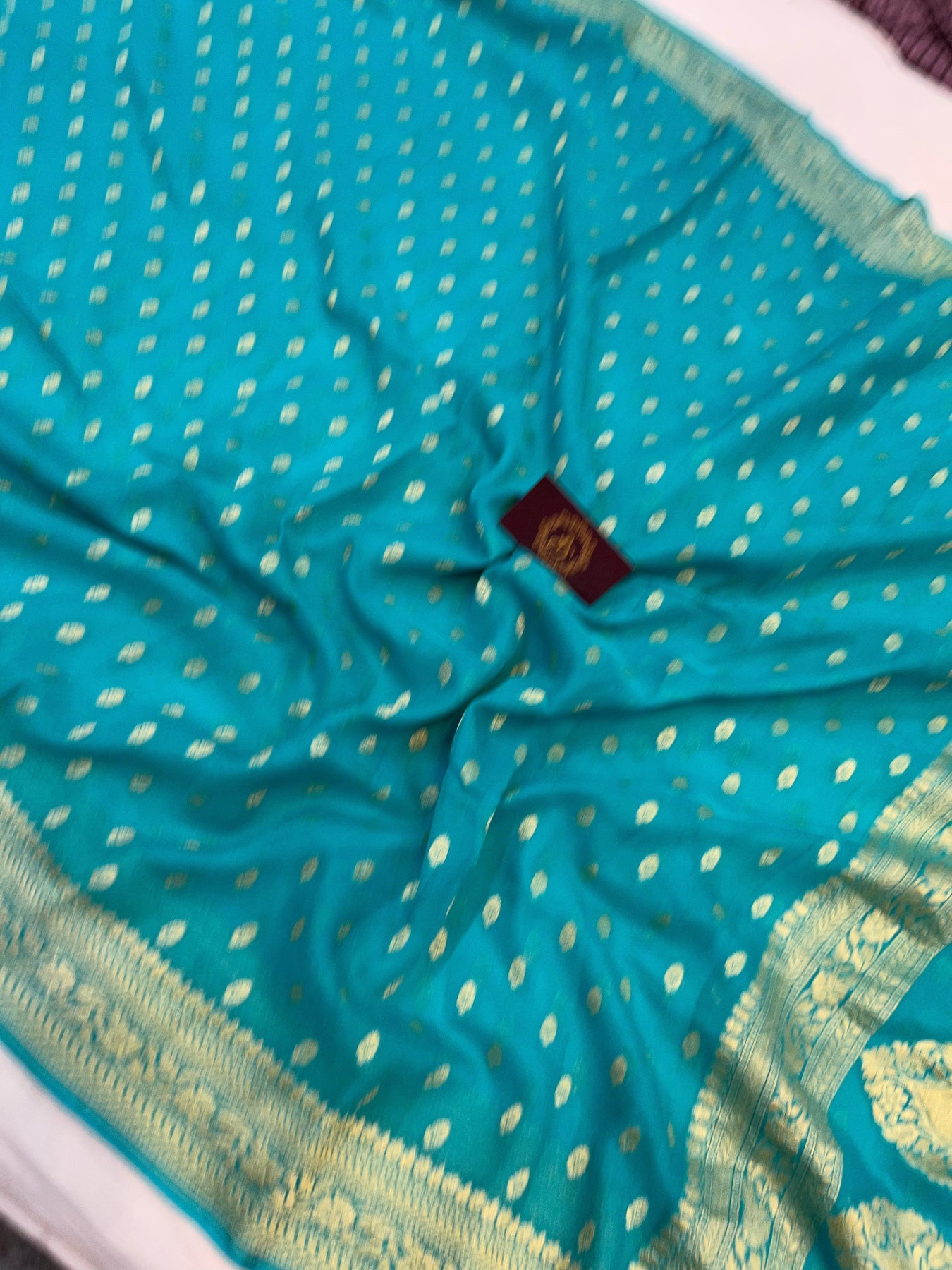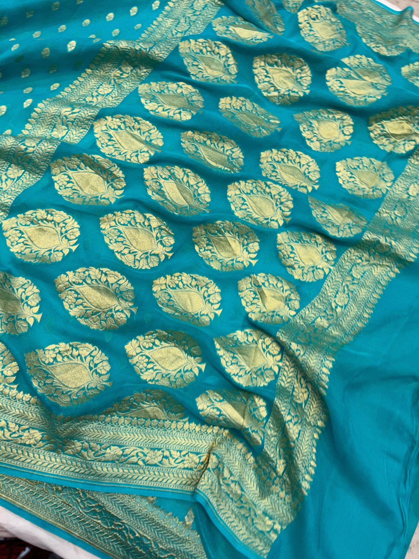 Turquoise Blue Banarasi Handloom Pure Khaddi Georgette Saree