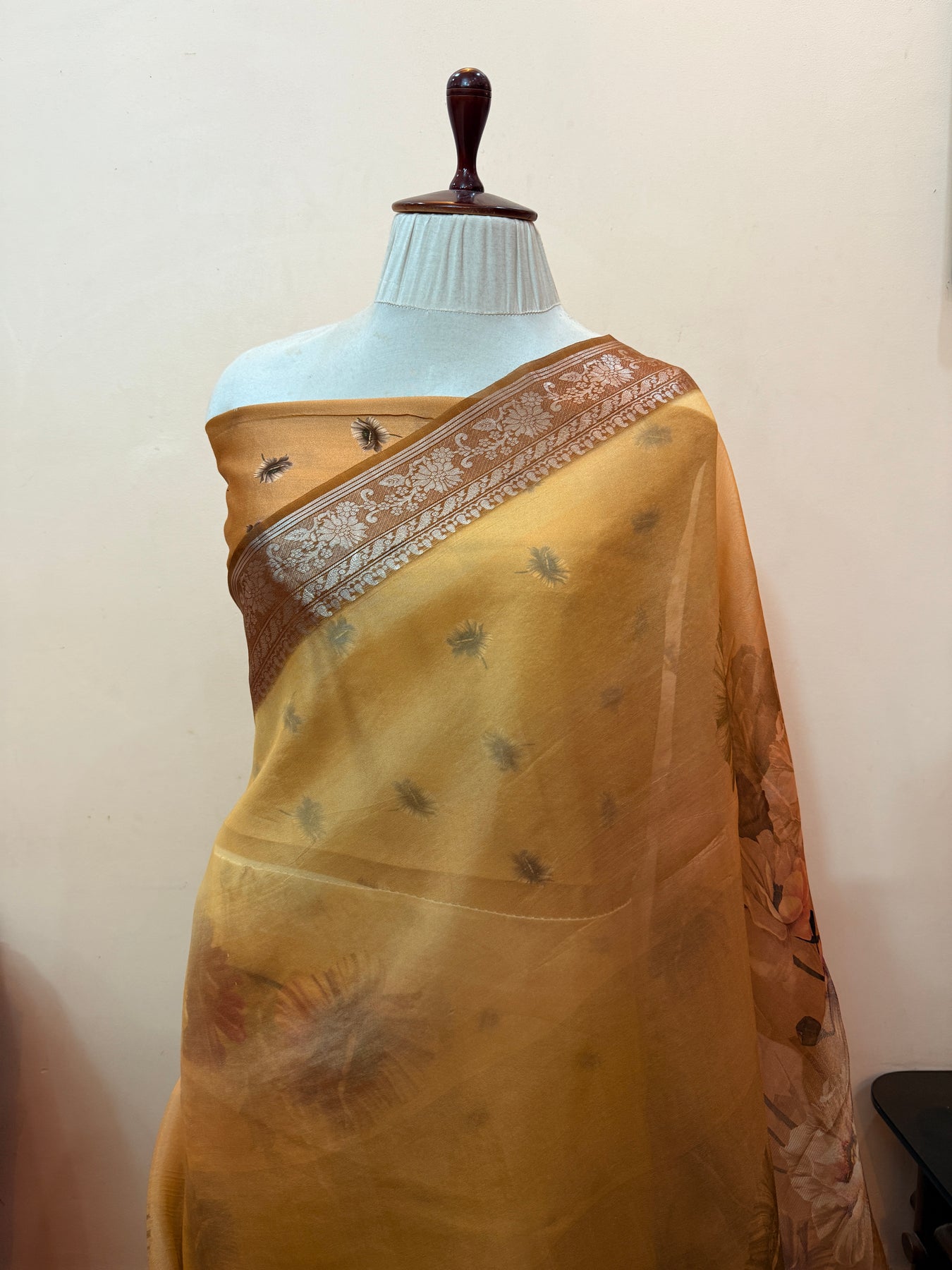 This stunning Beige Banarasi Kora silk saree combines timeless elegance with a touch of contemporary flair. The Kora silk fabric is light, breathable, and luxurious, creating a delicate yet rich look. The saree is adorned with digital print work that infuses a fresh, modern feel into the traditional Banarasi style. The prints are vivid and intricate, featuring beautiful patterns that seamlessly blend with the luxurious texture of the silk.