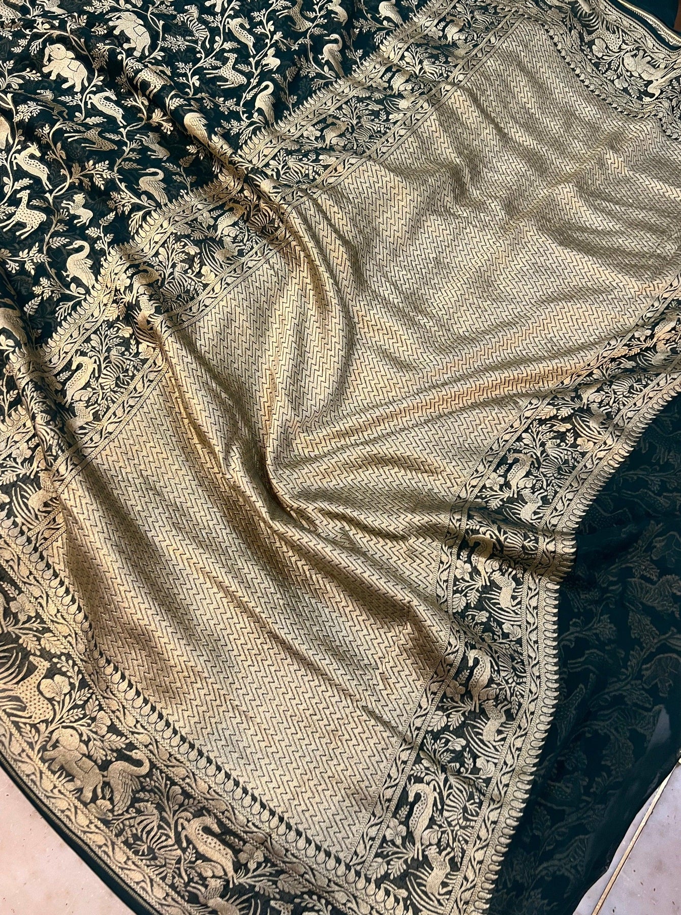 • Color - An enchanting Bottle Green with scintillating palla and border.