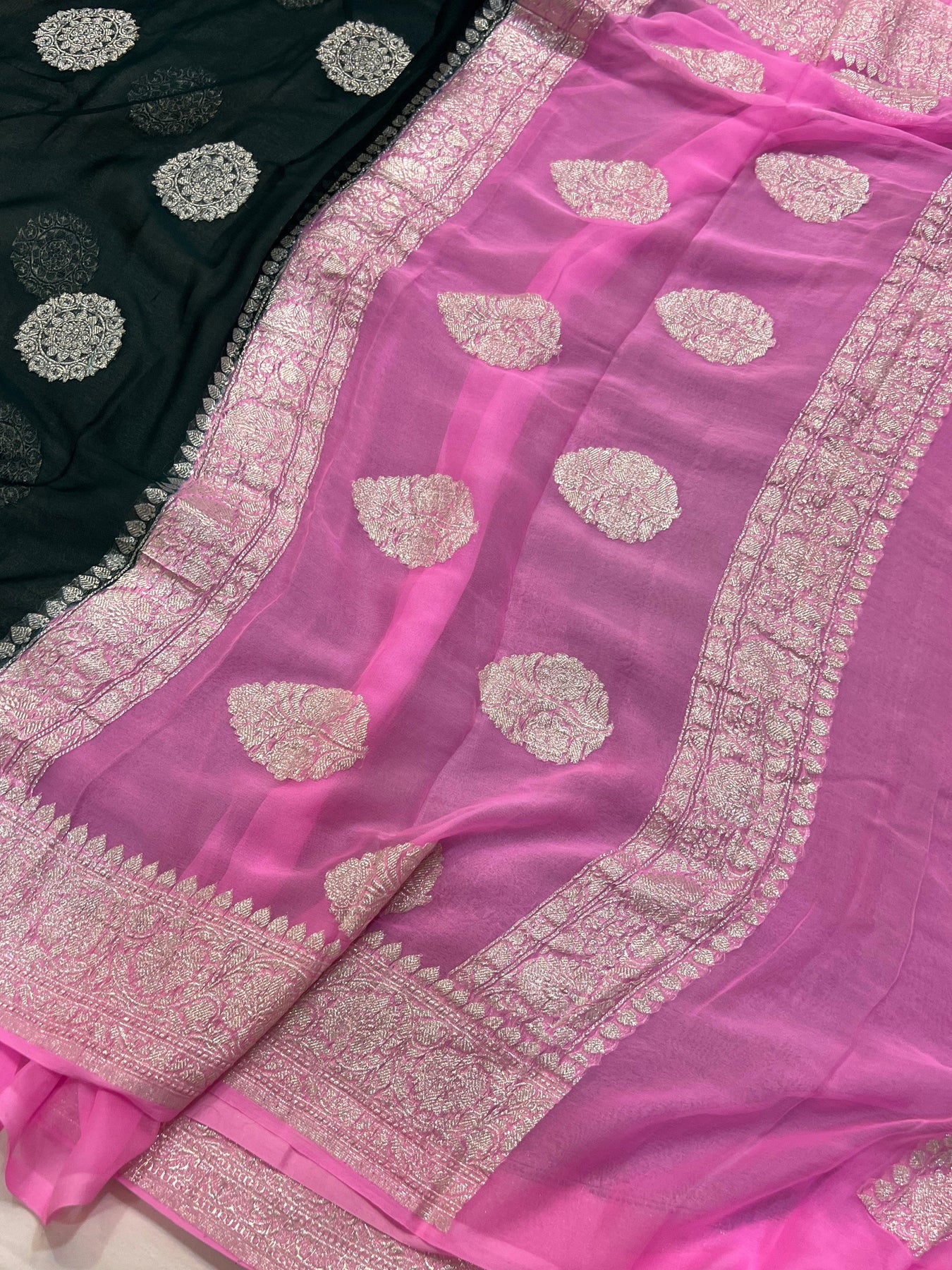 - Color - Bottle Green Banarasi saree with baby pink contrast.