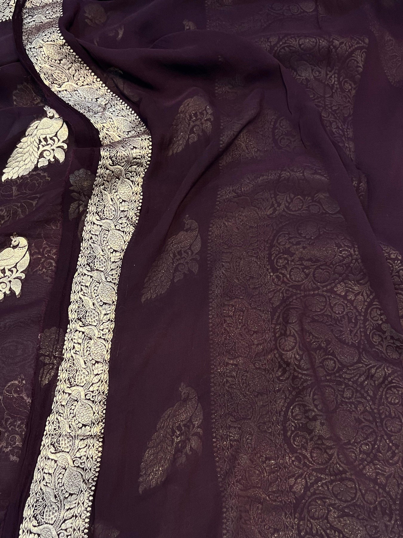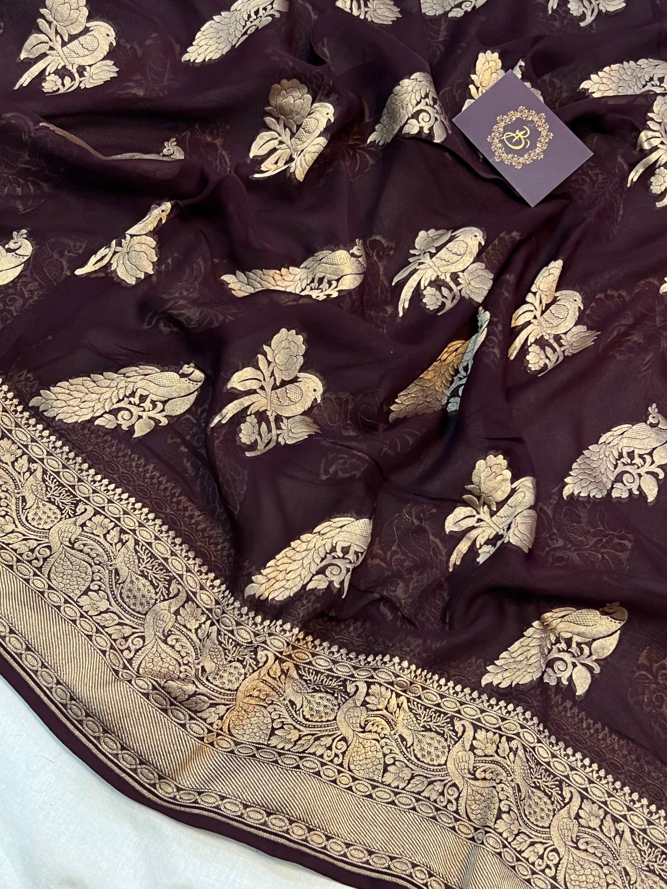 A stunning Brown Banarasi handloom classic. The authentic bird motifs in golden zari handwoven in the finest chiffon georgettes. It comes with a plain blouse. It takes around 10 days to weave this rich and luxurious piece of our tradition.