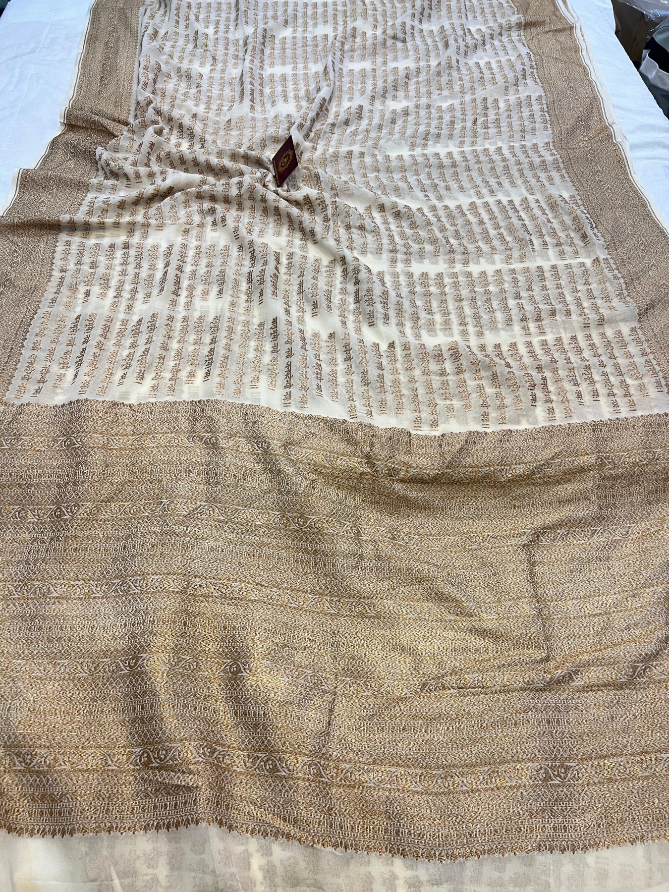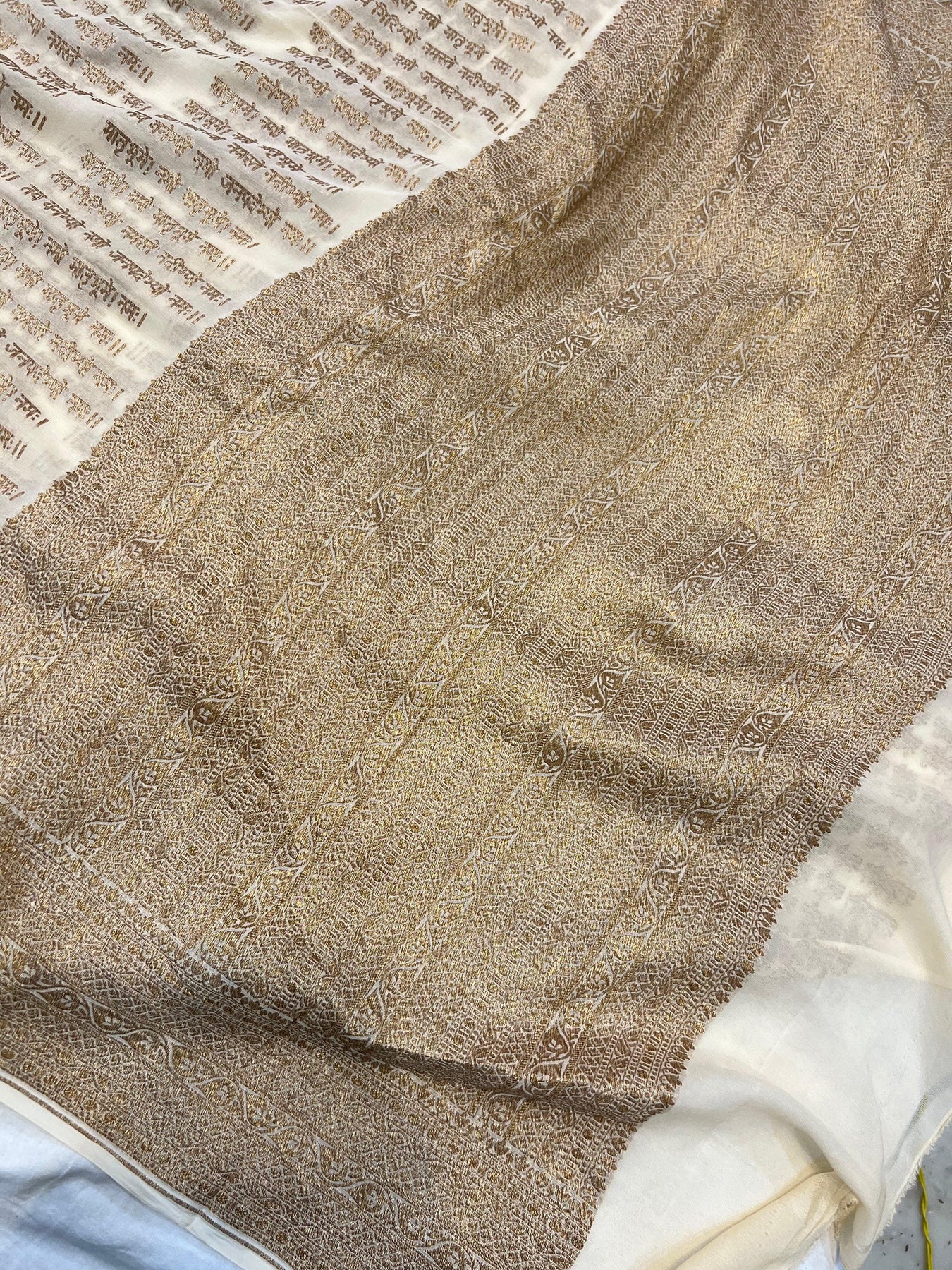 This pure Banarasi khaddi georgette saree features exquisite antique zari work and is enhanced with Sanskrit shlokas woven into the fabric. The soft, flowing saree showcases traditional motifs with a regal golden sheen from the zari. It comes with a plain blouse piece adorned with a matching border, offering a perfect blend of elegance and cultural richness.