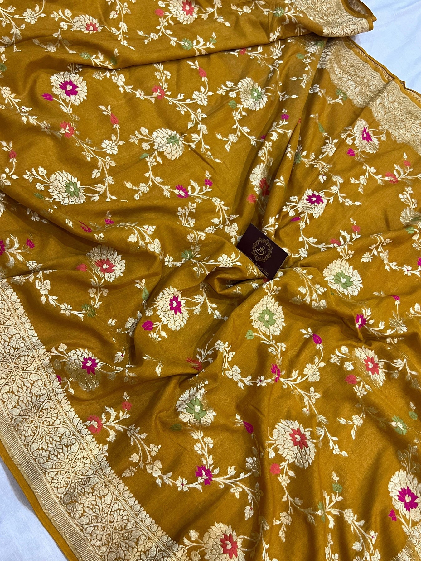 A stunning Mustard Yellow Banarasi handloom classic. The authentic meenakari jaal work with light golden zari handwoven in the finest moonga georgettes, comes with a plain blouse. It takes around 10 days to weave this rich and luxurious piece of our tradition.