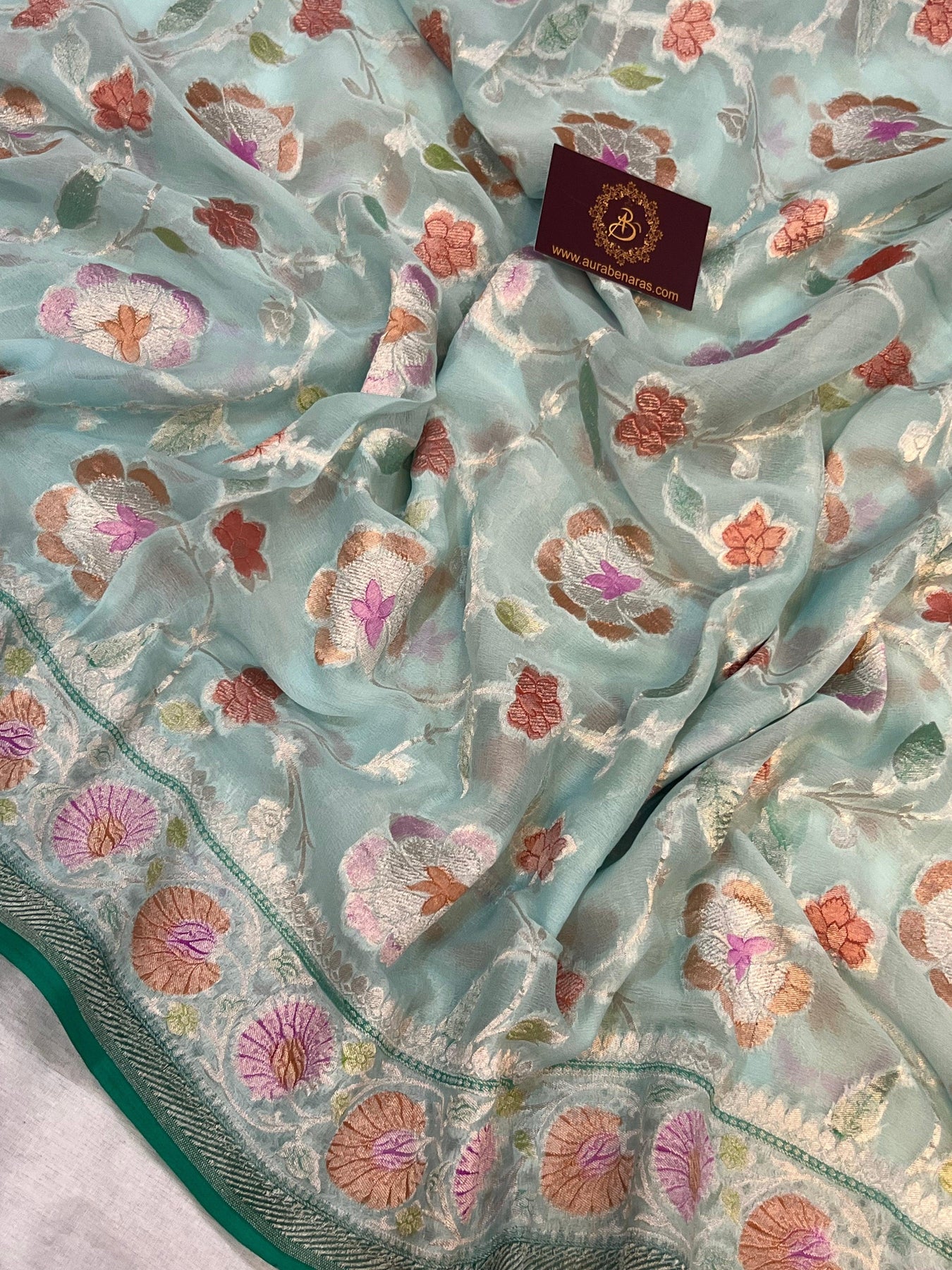 Pale Blue Rangkaat Banarasi Khaddi Georgette Saree - Aura Benaras