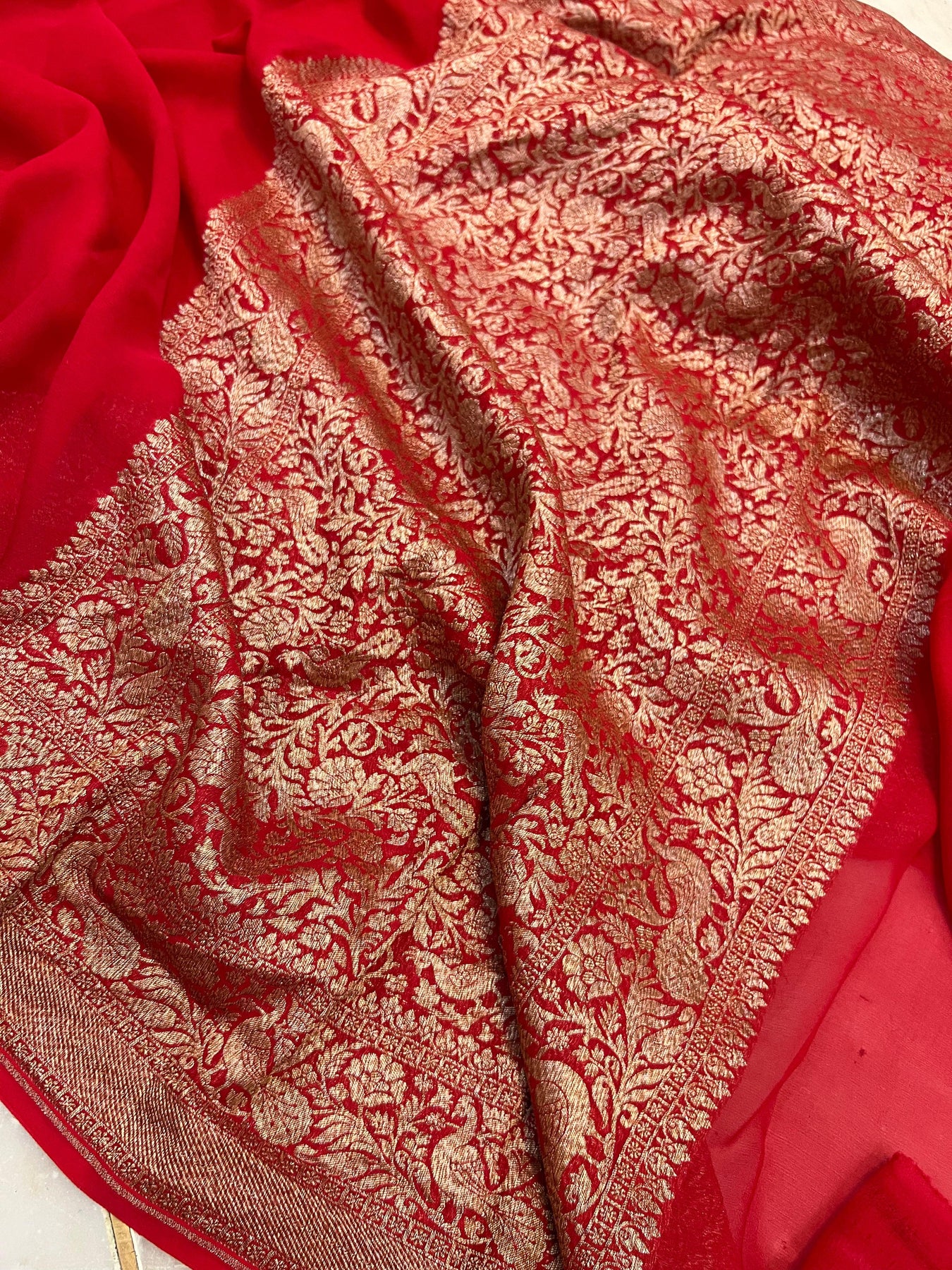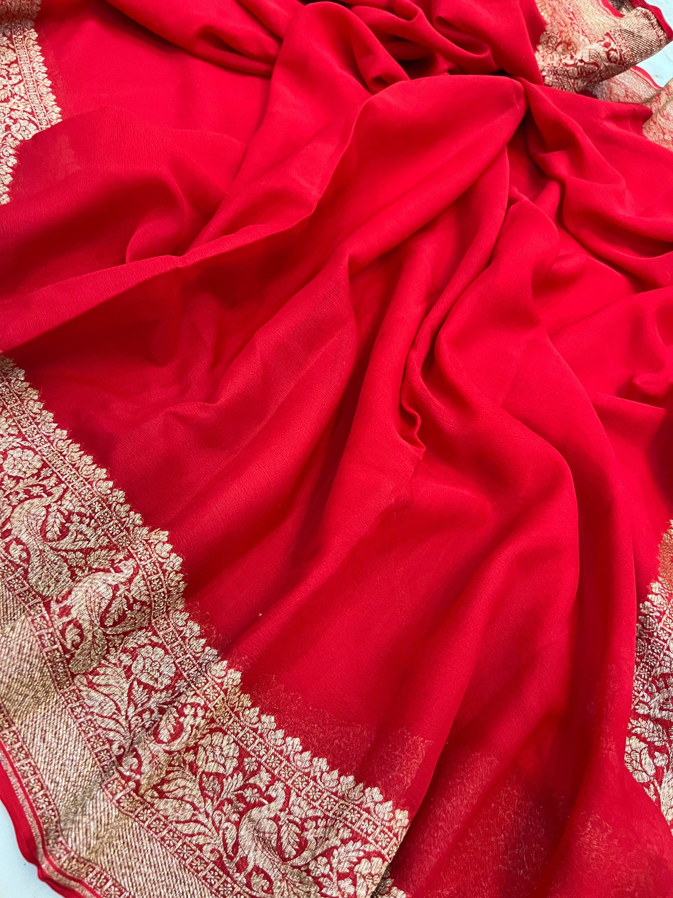 A stunning Red Banarasi handloom classic.The authentic plain saree with antique zari handwoven in the finest chiffon georgettes, comes with a heavy blouse. It takes around 10 days to weave this rich and luxurious piece of our tradition.