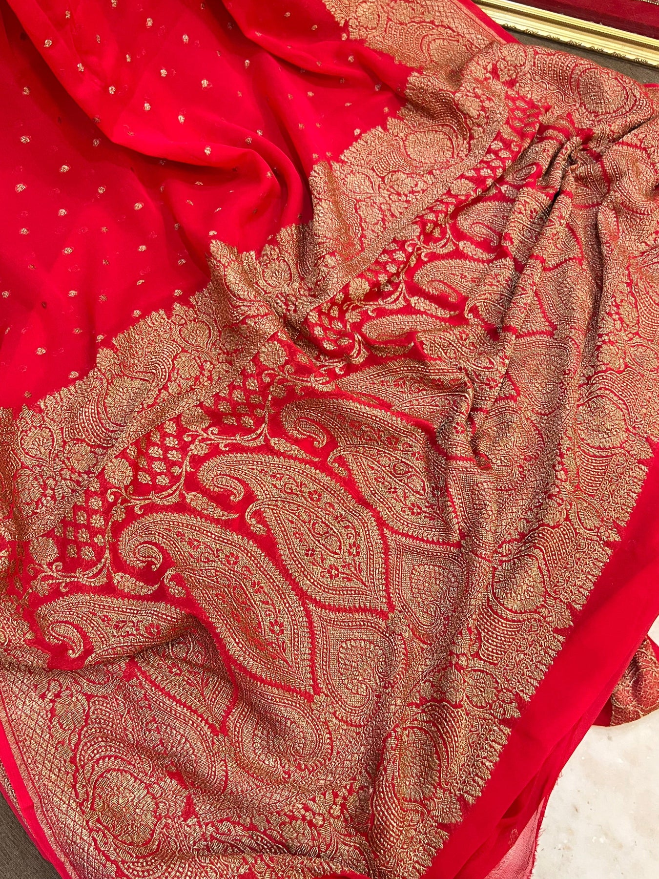 A stunning Red Banarasi handloom classic. The saree has small motifs all over the saree with designer border. Handwoven in the finest chiffon georgettes with antique zari work. The saree comes with a same color plain blouse piece. It takes around 10 days to weave this rich and luxurious piece of our tradition.