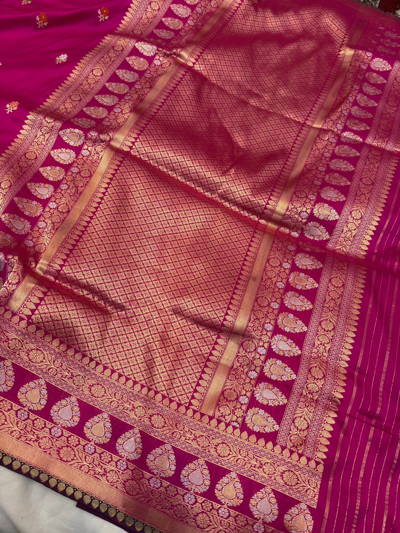 - Color - Hot Pink Banarasi saree with wine selvage.