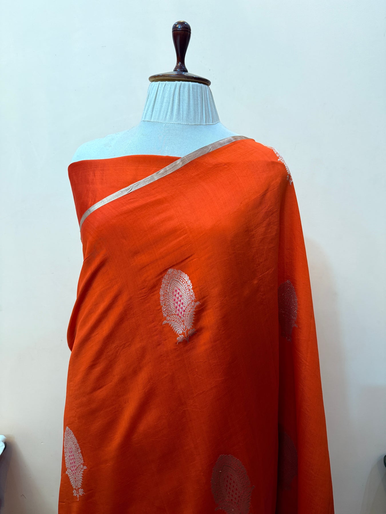 Turn heads with timeless elegance in this Orange pure silk handloom Banarasi saree, a masterpiece woven with precision and tradition. Crafted from the finest Katan silk, this saree features exquisite Kadhwa meena butas delicately scattered across the body — each one handwoven using the age-old Kadhwa technique, celebrated for its durability and intricate detailing.