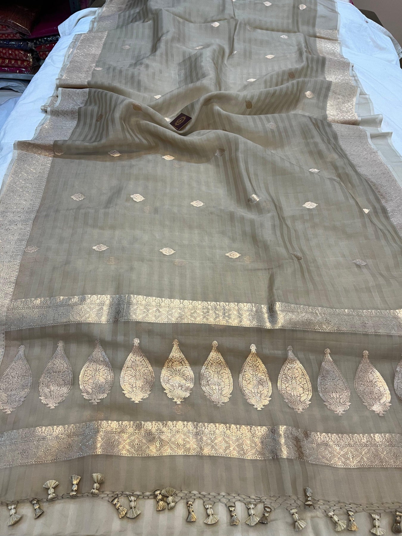 An amazing Handwoven Kora Silk in a Beige shade to take your breath away. This vintage piece has allover Kadwa(Kadhwa) floral motifs in golden and silver zari with a kadhwa banarasi border in golden zari. The blouse piece is plain with a border. This handmade treasure exemplifies the Craftsmanship of our Weavers, who have kept the art alive by passing the knowledge from generation to generation. It takes around 15-20 days for artisans to weave one.