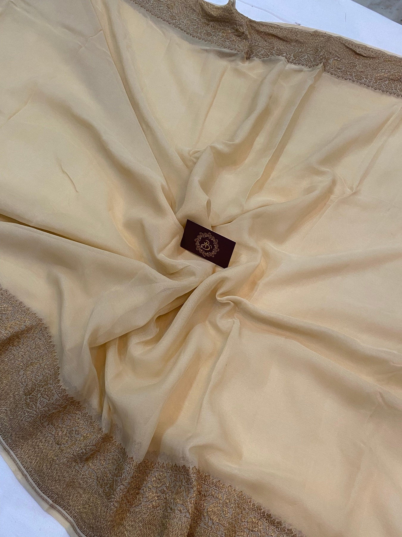 A stunning Beige Banarasi handloom classic.The authentic plain saree with antique zari handwoven in the finest chiffon georgettes, comes with a heavy blouse. It takes around 10 days to weave this rich and luxurious piece of our tradition.