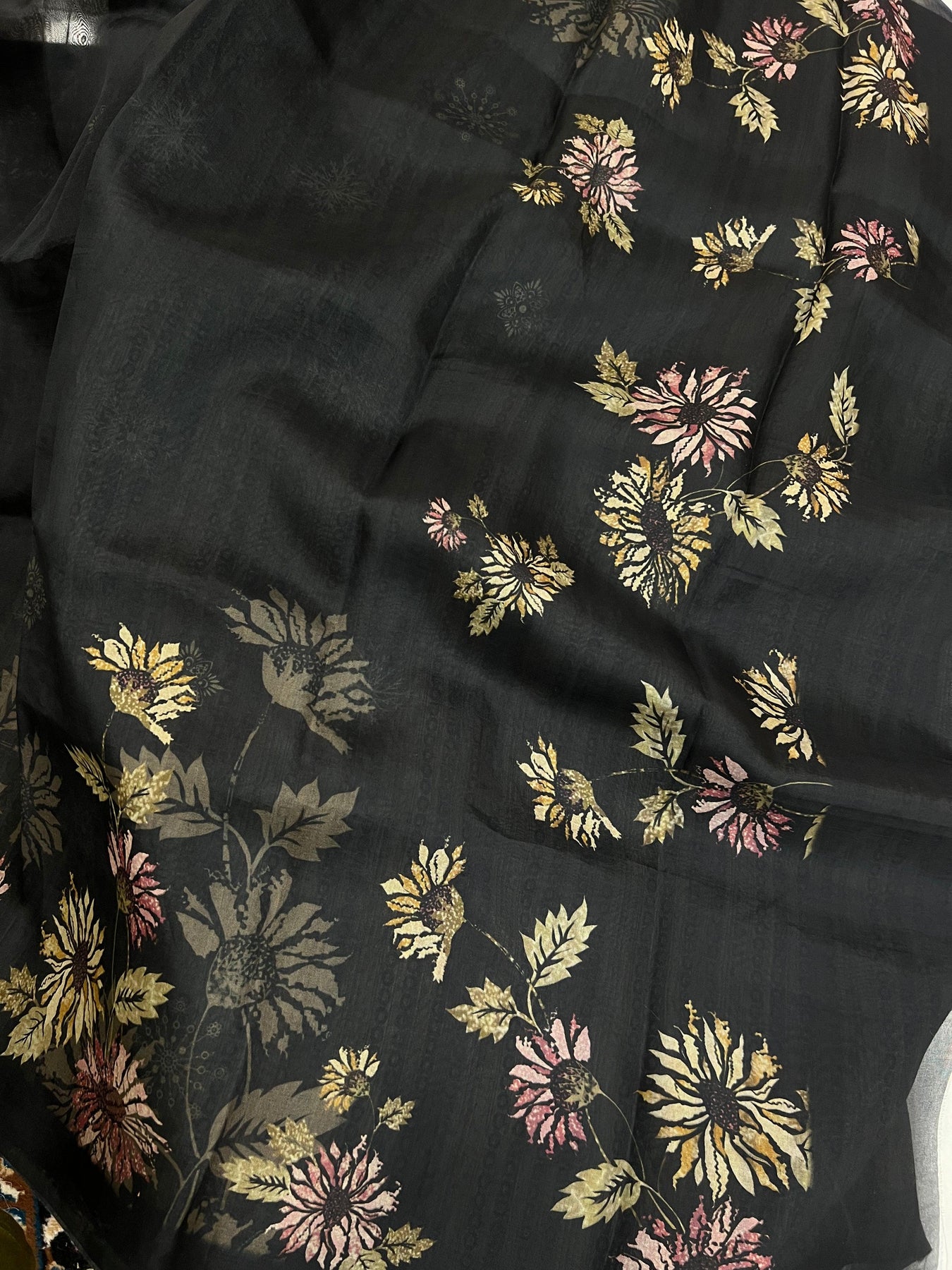 A pure kora silk saree with beautiful floral printed work is a stunning piece of craftsmanship. The fabric is light and airy, featuring a subtle sheen that enhances the elegance of the saree. The floral prints are intricately designed, showcasing vibrant colors that pop against the soft backdrop of the kora silk. The motifs often include delicate blossoms, leaves, and vines, creating a harmonious and refreshing look. The prints can be strategically placed along the borders or scattered throughout the body of the saree, giving it a lively and graceful appearance.