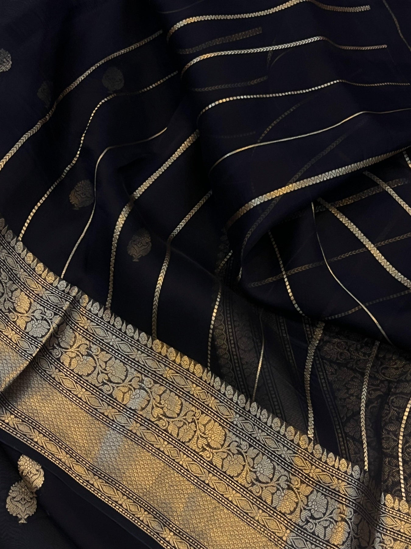 An amazing Handwoven Kora Silk in a Black color to take your breath away. This vintage piece has allover Kadwa(Kadhua) motifs in golden zari. This handmade treasure exemplifies the Craftsmanship of our Weavers, who have kept the art alive by passing the knowledge from generation to generation. It takes around 15-20 days for artisans to weave one.
