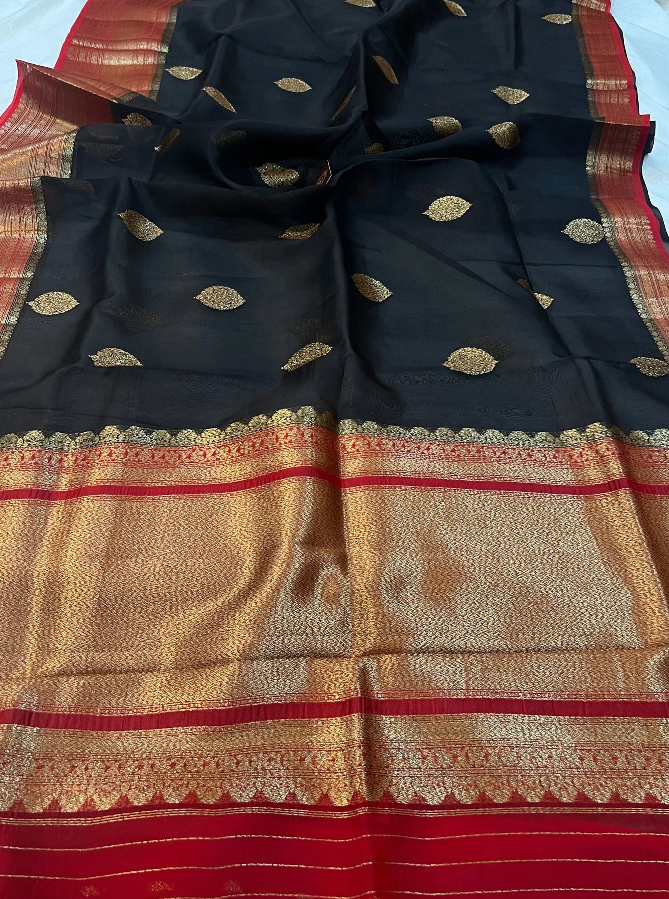 An amazing Handwoven Kora Silk in a Black color to take your breath away. This vintage piece has allover Kadwa(Kadhua) motifs in antique zari. This handmade treasure exemplifies the Craftsmanship of our Weavers, who have kept the art alive by passing the knowledge from generation to generation. It takes around 15-20 days for artisans to weave one.