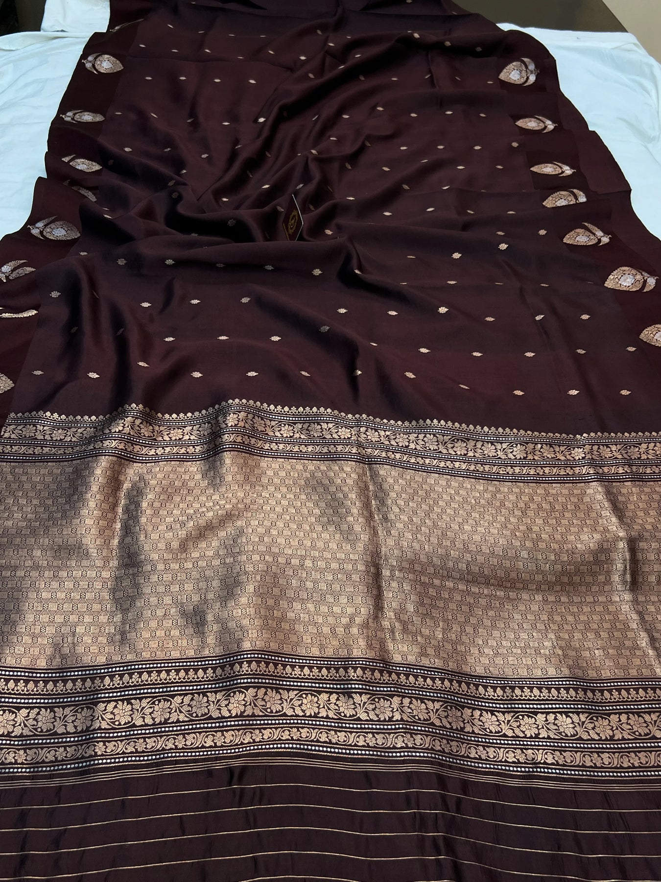 The pure Banarasi handwoven silk saree is a stunning example of exquisite craftsmanship and timeless elegance. Featuring allover kadhwa motifs, the saree showcases intricate designs that weave a rich tapestry across the luxurious silk fabric, adding depth and texture to its overall appearance.