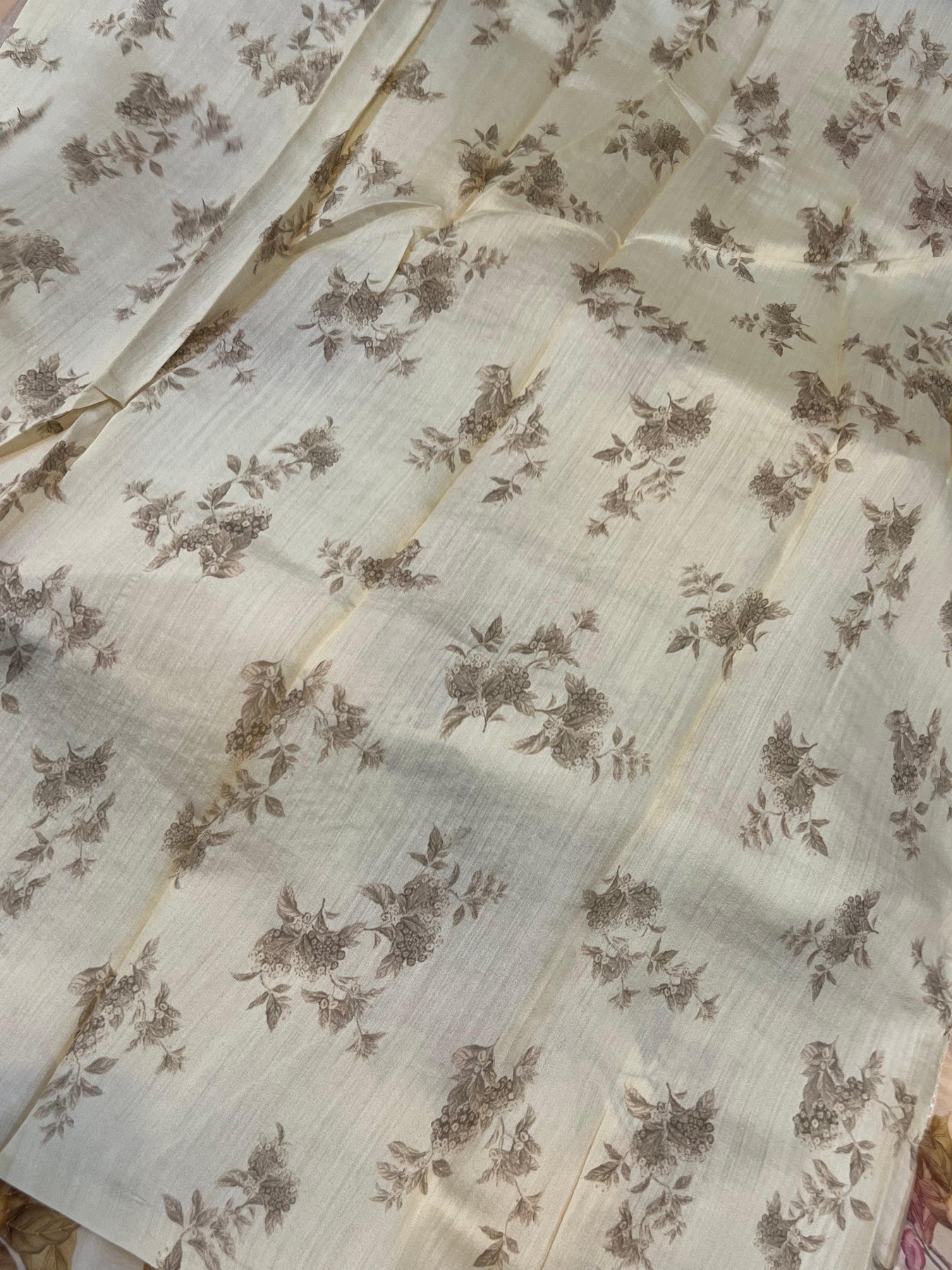 This pure Banarasi Kora silk saree is a stunning fusion of heritage and modern design. The fabric, Kora silk, is lightweight and graceful, offering an airy yet luxurious feel. The saree features intricate digital print work, bringing a vibrant and contemporary edge to the traditional Banarasi silk. The prints are beautifully designed, showcasing delicate motifs that complement the classic appeal of the Kora silk.