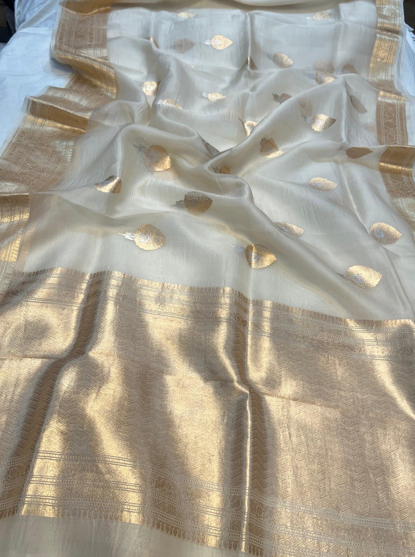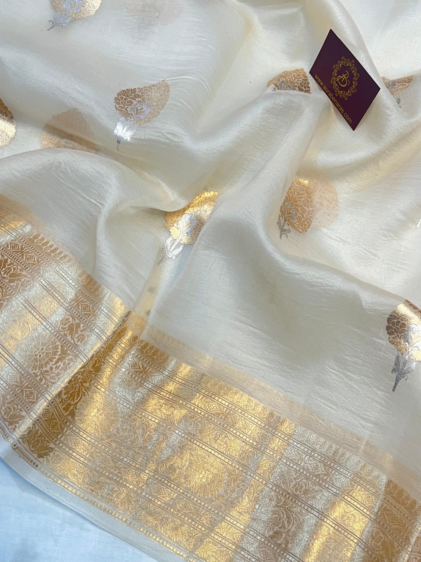 Cream Pure Banarasi Handloom Kora Silk Saree