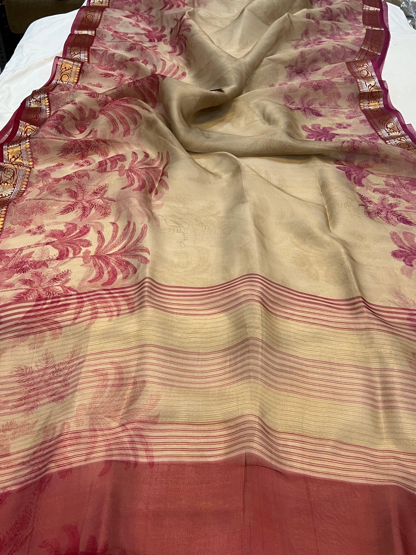 Cream Pure Banarasi Handloom Kora Silk Saree
