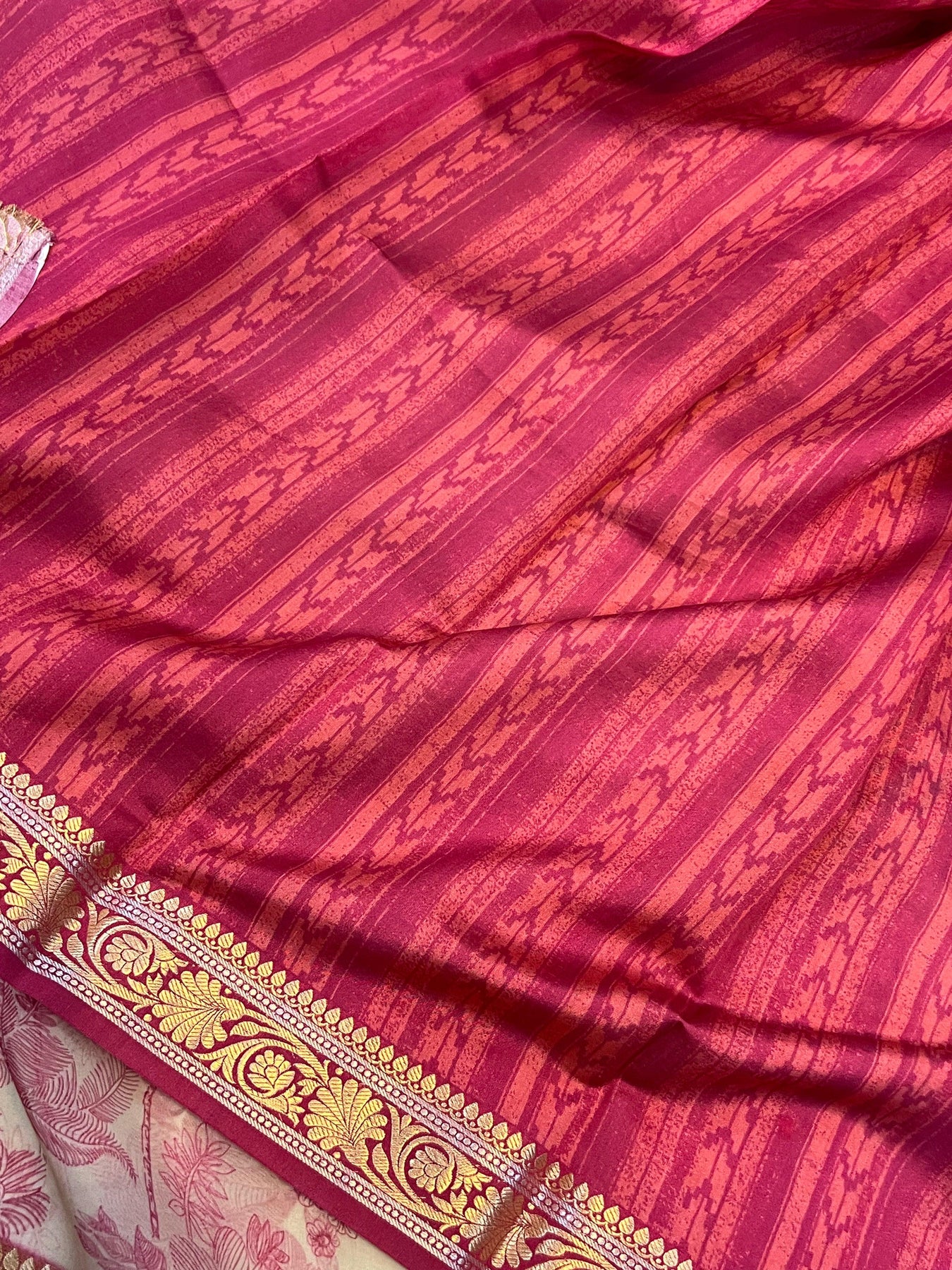 Elevate your ethnic style with this pure Banarasi handloom Kora silk saree, featuring vibrant digital print work and a graceful golden zari Banarasi border. Lightweight and elegant, it’s ideal for festive wear, celebrations, and special occasions. This saree comes with a matching Chiniya silk blouse piece. Shop now to add this modern-meets-traditional beauty to your wardrobe!