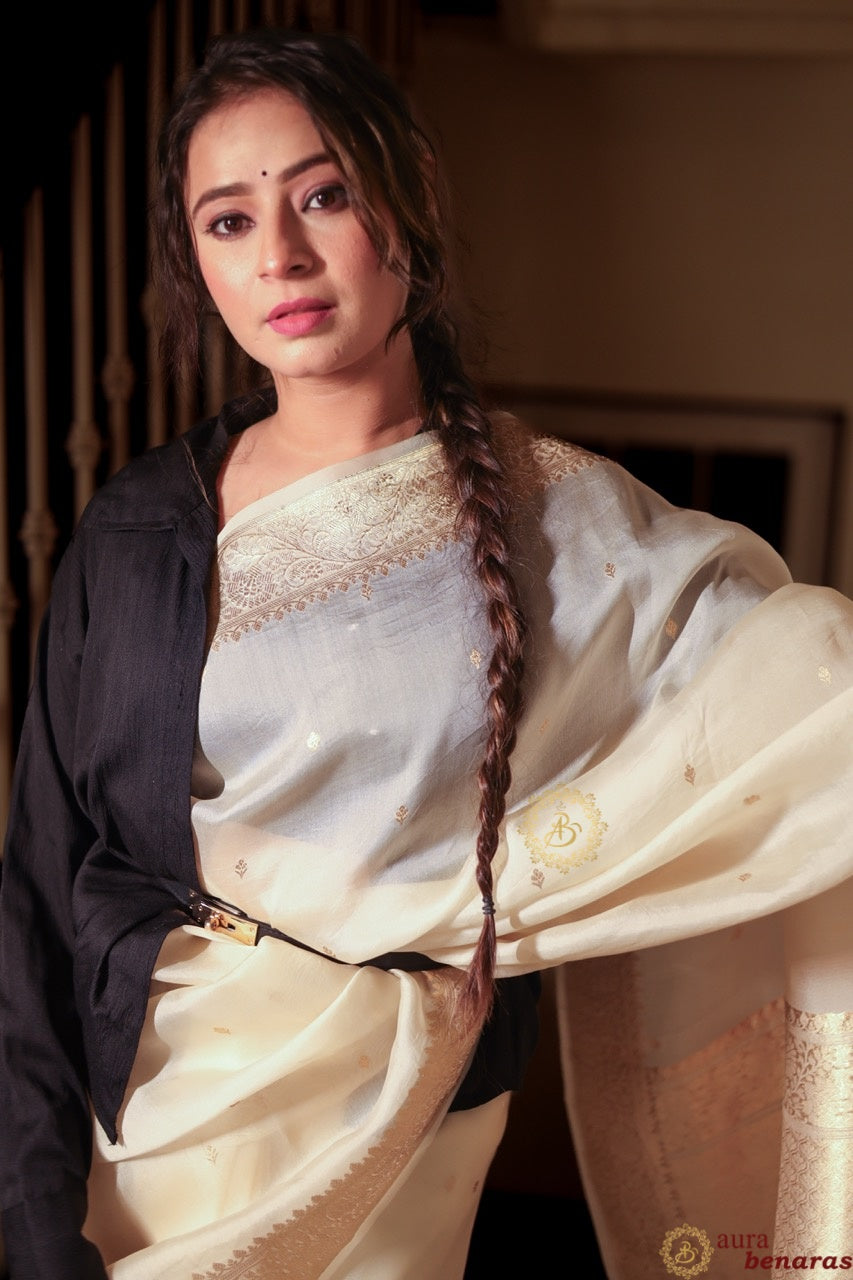 Cream Pure Kora Silk Handloom Banarasi Saree