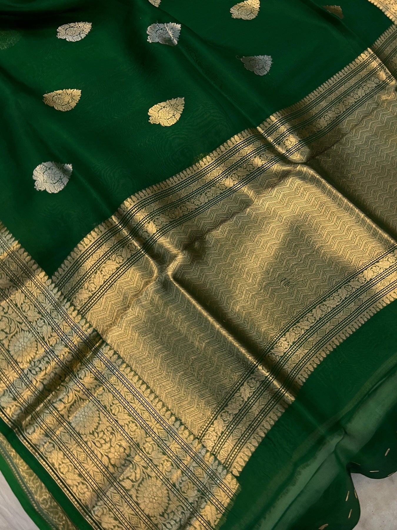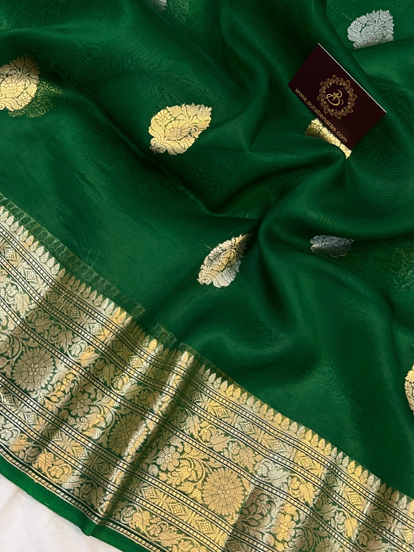Dark Green Banarasi Handloom Kora Silk Saree - Aura Benaras