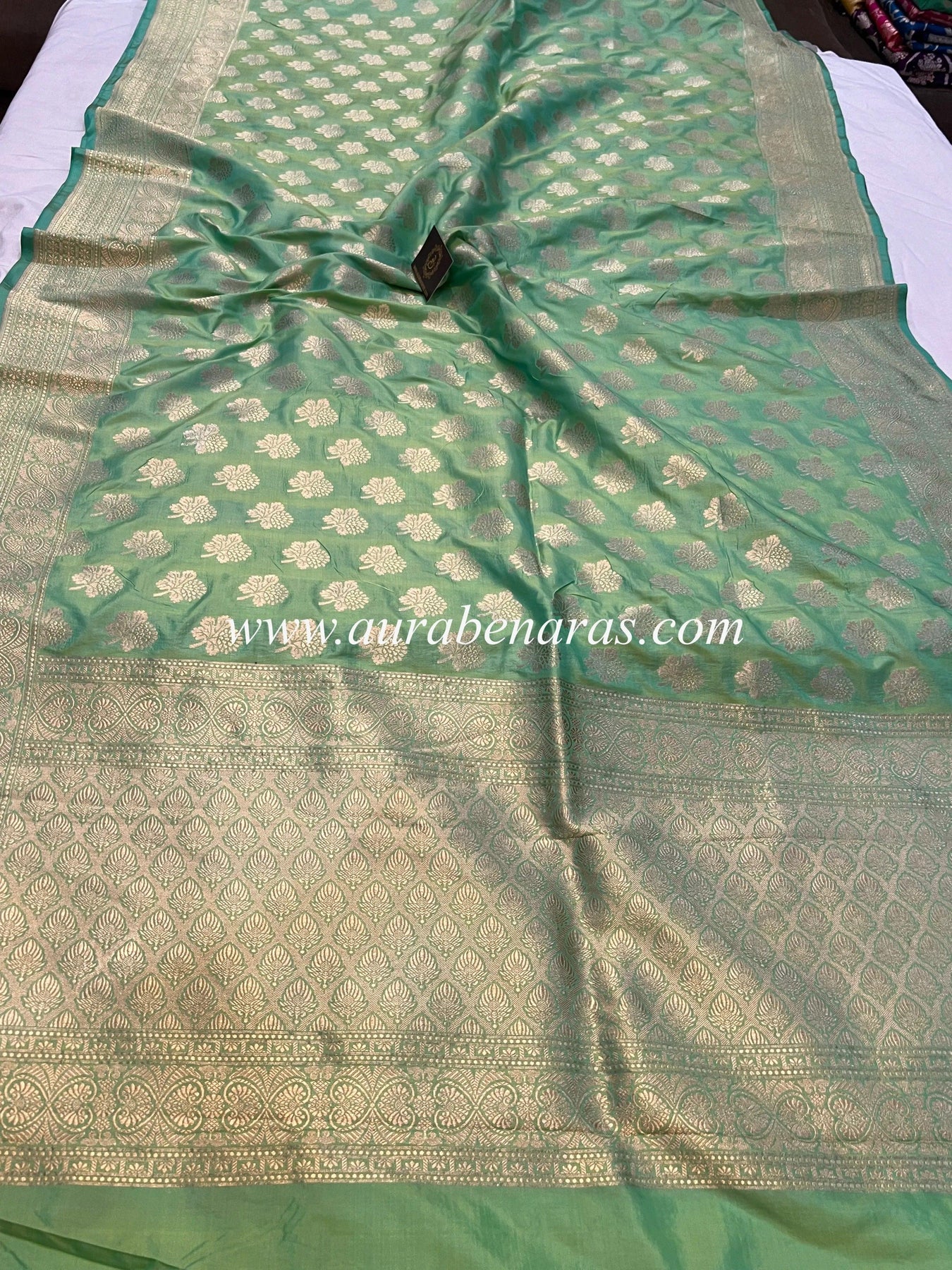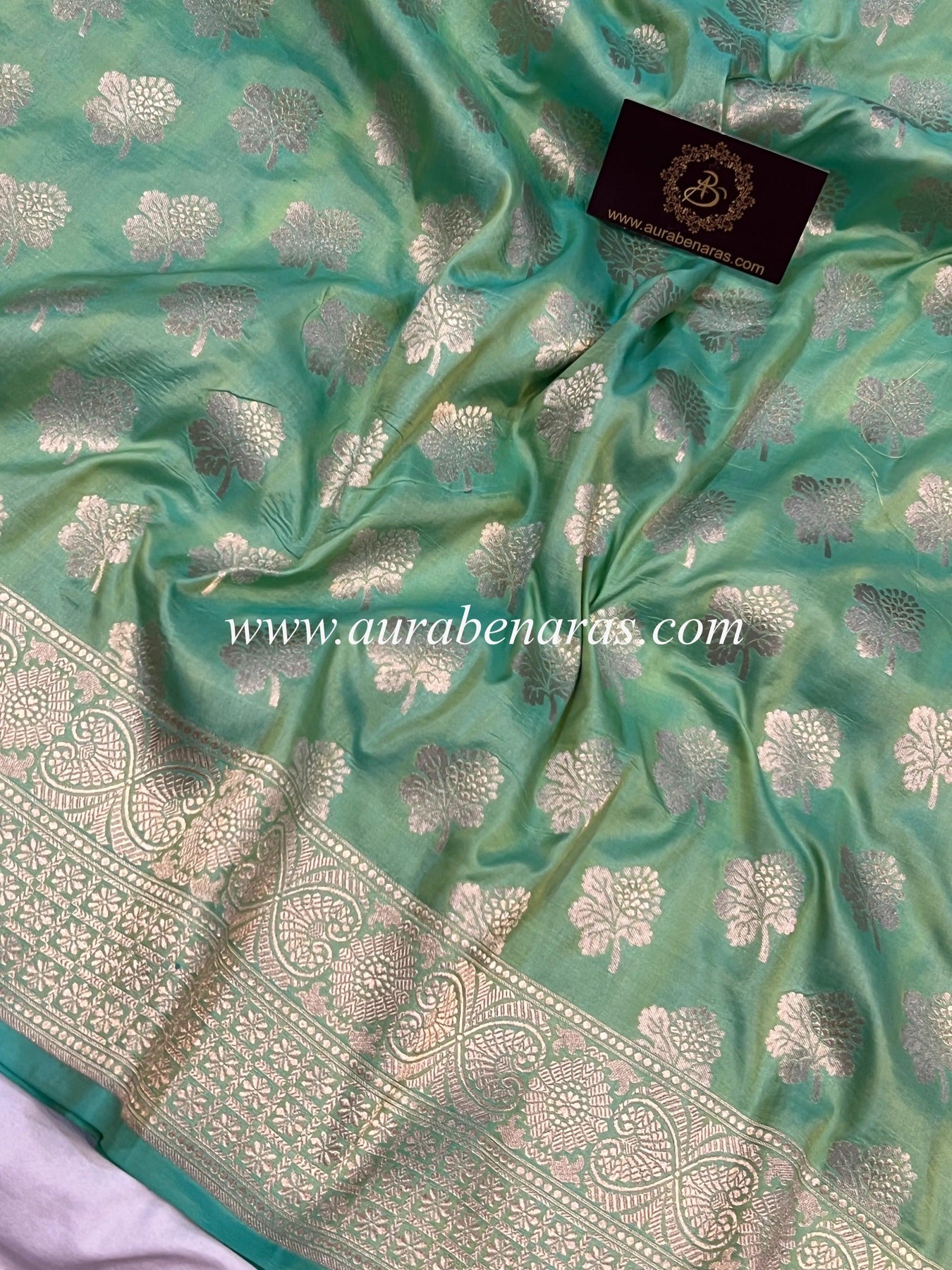 This magnificent piece is testament to the art possessed by our weavers. Made on pure katan silk, this authentic saree has an all buti work with beautiful border and pallu. It comes with a same colored pure katan silk plain blouse with border. It takes our master craftsmen 12-18 days to weave this piece of tradition.