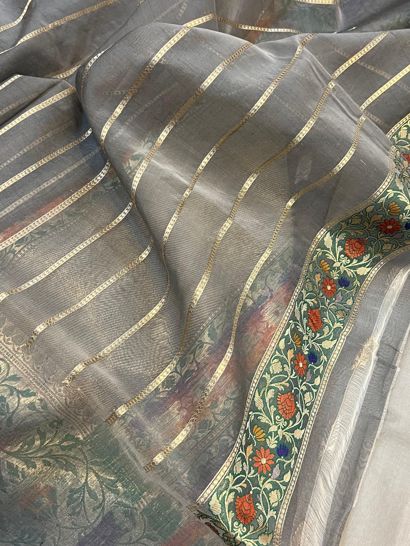 Grey Pure Banarasi Handloom Kora Silk Saree