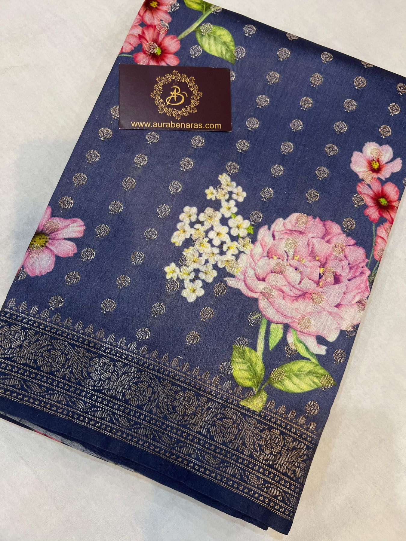 This pure Banarasi handloom Chiniya silk saree features a vibrant digital print in multiple colors, creating a modern yet traditional appeal. The saree is beautifully bordered with a classic Banarasi design, adding an elegant touch. The blouse piece complements the saree with a charming floral print, enhancing the overall aesthetic. The fusion of rich Chiniya silk, striking digital patterns, and the timeless Banarasi border makes this saree perfect for those looking for a blend of contemporary style and traditional craftsmanship..