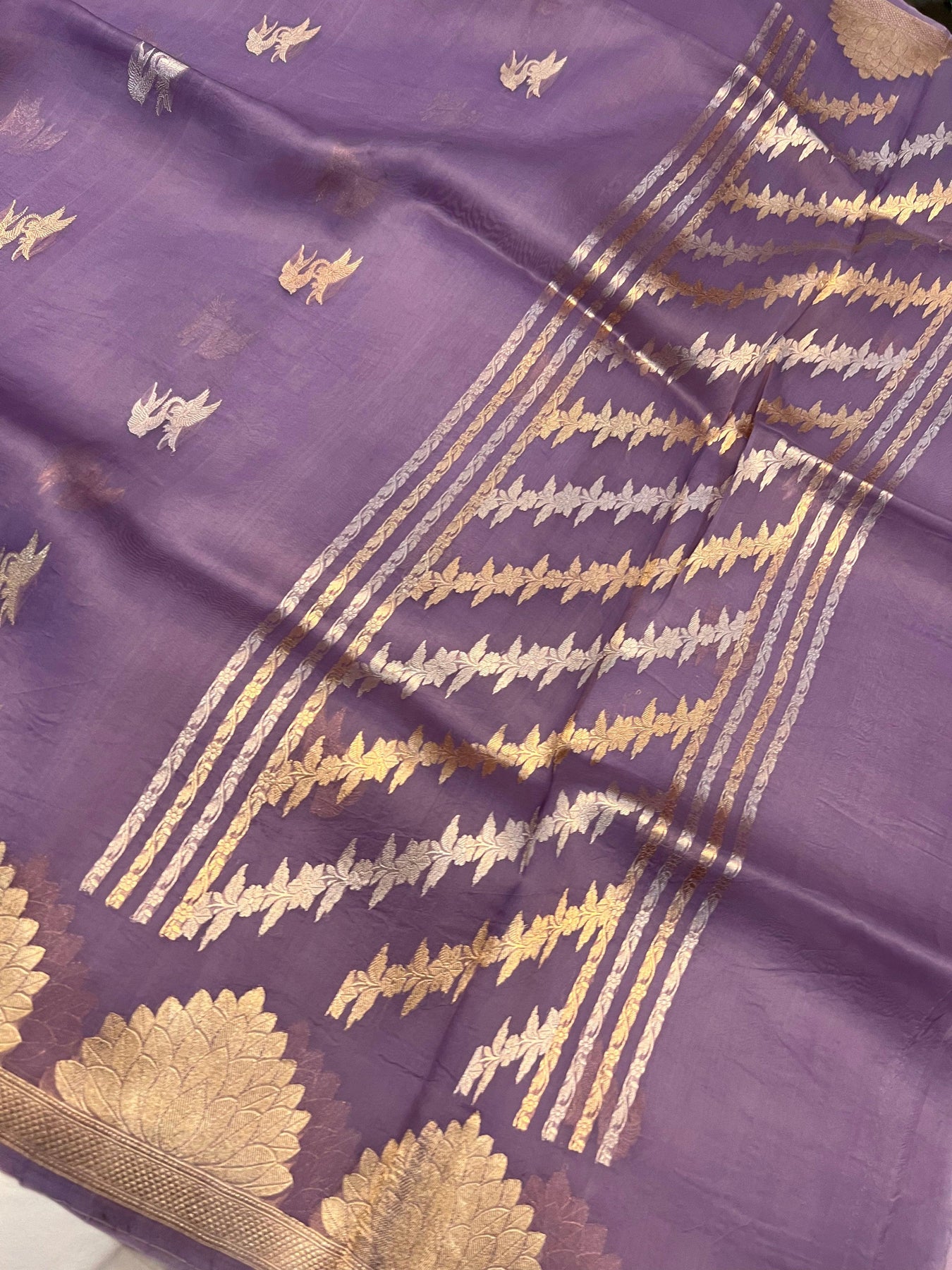 The pure Banarasi handwoven kora silk saree is a captivating fusion of tradition and elegance. Adorned with allover kadhwa bird motifs, the saree features intricate designs that are skillfully woven into the soft kora silk fabric, creating a rich texture that exudes sophistication.