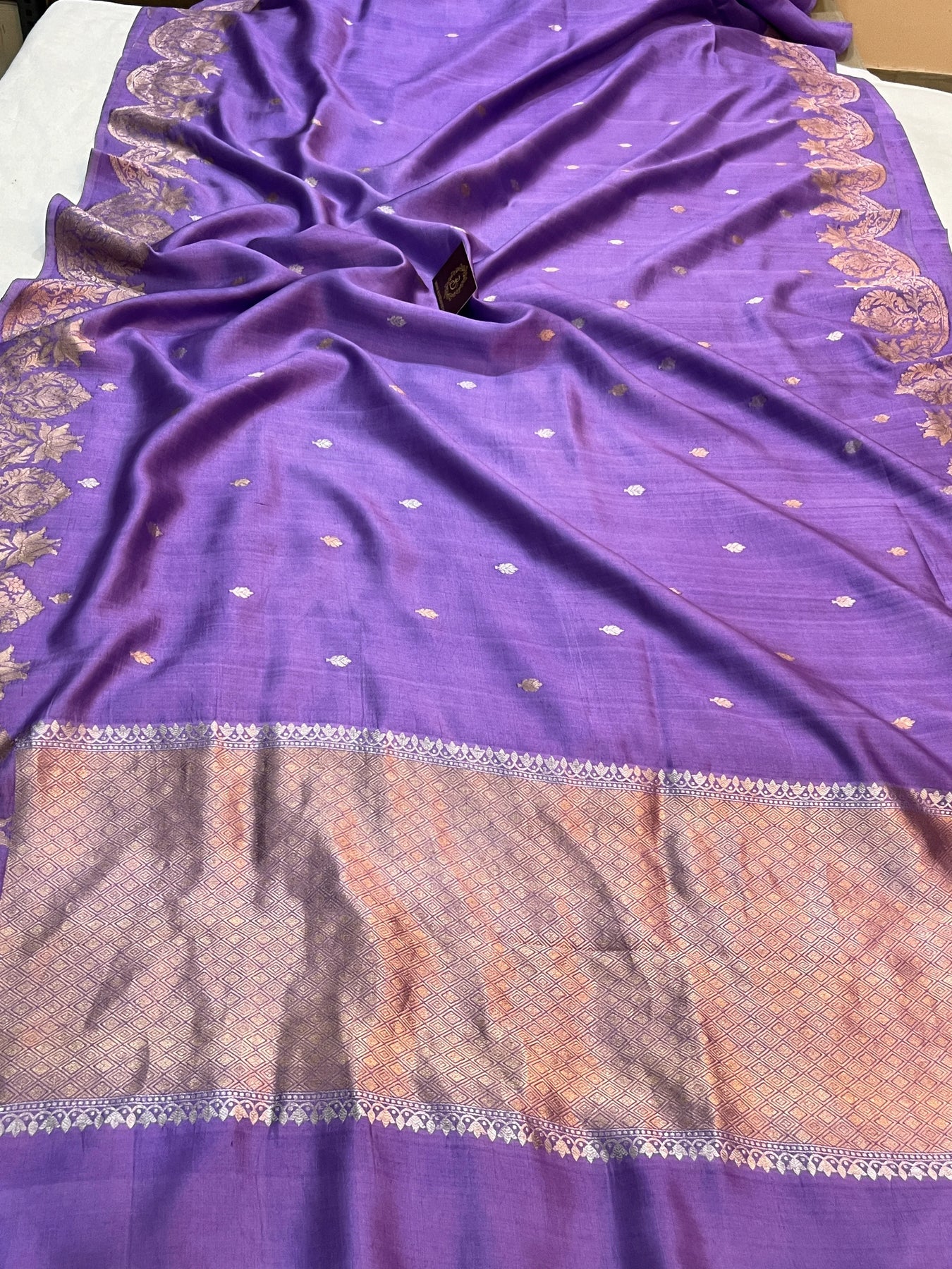 Indulge in timeless elegance with this exquisite Lavender pure silk handloom Banarasi saree, meticulously woven with traditional Kadhwa butis that reflect the artistry of Varanasi’s master weavers. Crafted from luxurious pure silk, the saree features an intricate pattern of delicate butis scattered across the body, lending it a rich, regal charm. What truly sets this piece apart is its scallop border, finely woven in shimmering gold zari with designer detailing. The unique scalloped edge adds a modern twist to the classic Banarasi weave, creating a striking yet graceful silhouette.