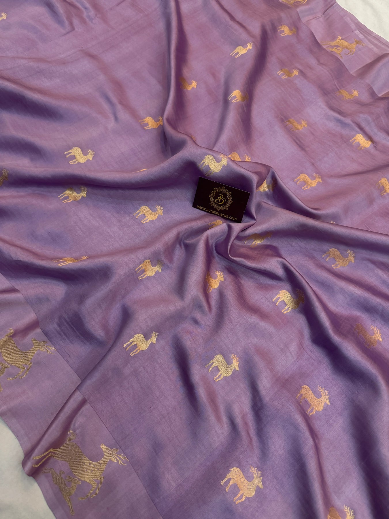Elevate your wardrobe with this exquisite Lavender Pure Silk Handloom Banarasi Saree, featuring intricate Kadhwa motifs woven in lustrous golden zari. The saree is adorned with a distinctive Mashru silk border, showcasing detailed Kadhwa deer motifs, adding a touch of heritage artistry. Complementing the saree is a blouse piece embellished with delicate small butis, offering versatility and elegance. Perfect for weddings and festive occasions, this saree is a testament to timeless Banarasi craftsmanship
