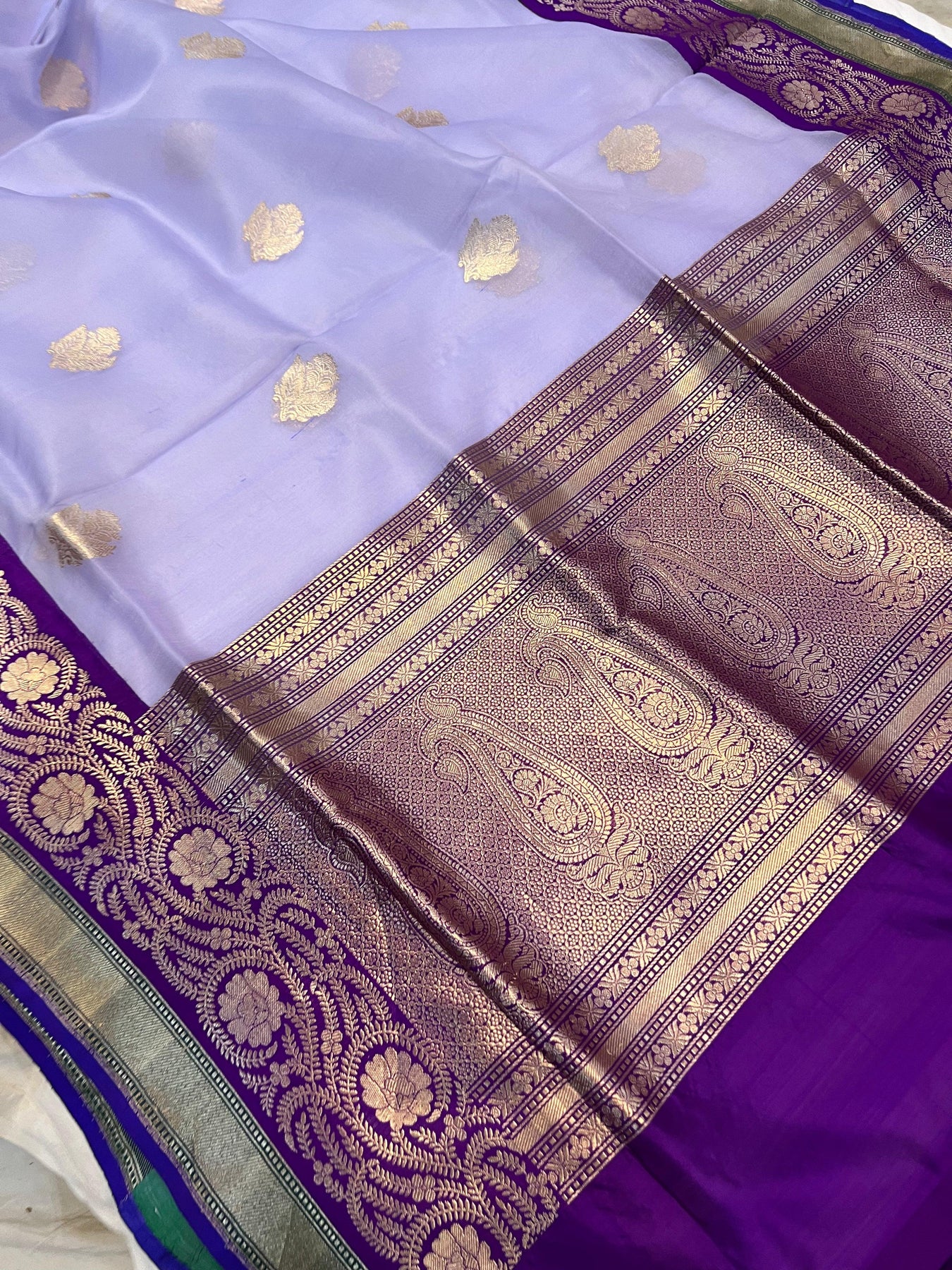 - Color - An enchanting Lilac with scintillating Purple palla and border.