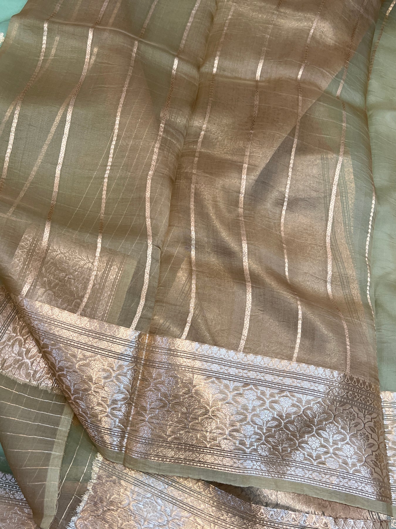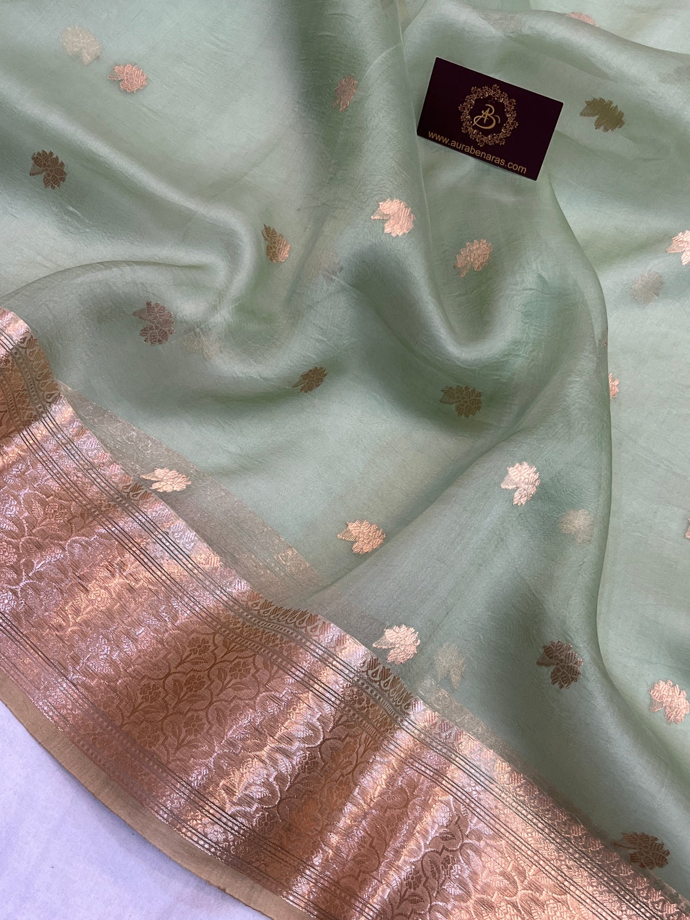 This Mint Green pure Banarasi Kora organza saree features intricate all-over Kadhwa motifs woven in golden zari, creating an elegant and luxurious look. The saree is complemented by a beautiful Banarasi border, adding richness to the overall design. The blouse piece comes with delicate golden zari lines, tying the ensemble together with a regal touch. Perfect for special occasions, the combination of yellow, gold, and fine craftsmanship radiates traditional charm.