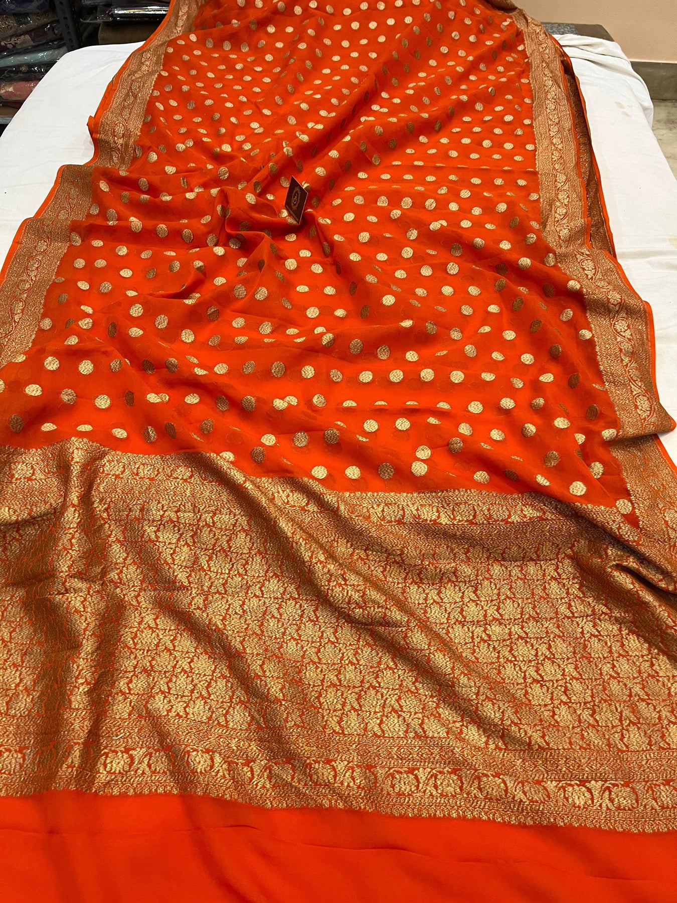 Experience sheer elegance with this Pure Banarasi Khaddi Georgette Saree, handwoven with antique zari motifs and a rich Banarasi border. The lightweight, flowy drape makes it perfect for weddings & festive occasions. Comes with a plain blouse piece with a matching border. Shop now from Aura Benaras!